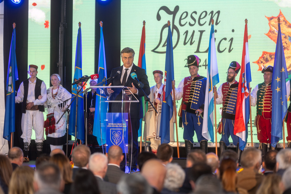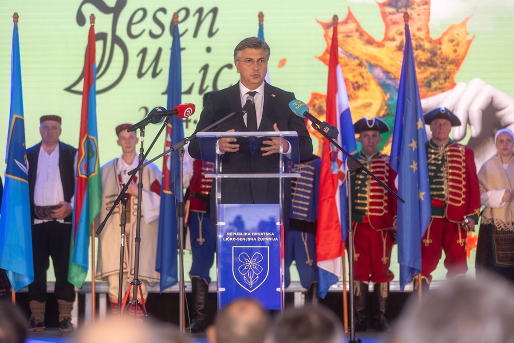 „S nama su danas županije-partneri iz Splitsko-dalmatinske, Šibensko-kninske i Virovitičko-podravske županije. Sve odlično surađuju s ovom županijom. To mi je posebno drago jer se vidi koliko je ova županija lijepa i posebna kada govorimo o trudu i radu ljudi koji ovdje žive”, rekao je Plenković te dodao: „Naš napredak je na zdravim temeljima. Gospodarski rast u ovoj godini bit će 3,6 posto, što je otprilike trostruko više nego prosjek unutar Europske unije. Inflaciju smo uspjeli obuzdati i ona će iznositi na godišnjoj razini oko tri posto. U Hrvatskoj danas radi oko 1.750.000 ljudi, odnosno više nego ikada do sada. Hrvatska nikada nije imala manju nezaposlenost. Ulaganja EU, države, državnih poduzeća nikada nisu bila veća, a Hrvatska je prepoznata i po vrhunskim uspjesima u turizmu. U ovih devet mjeseci imali smo preko 750 tisuća turista koji su ostvarili više od 3 milijuna noćenja, i ovom prigodom čestitam Ličko-senjskoj županiji na još jednoj rekordnoj turističkoj sezoni”, istaknuo je Plenković te proglasio otvorenom 26. Jesen u Lici.