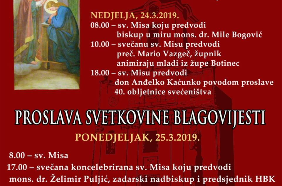 U ponedjeljak, na blagdan Blagovijesti misa se održava  od 8 sati, a glavna svečana koncelebrirana sveta misa od 17 sati. Predvodit će je mons. dr. Želimir Puljić, zadarski nadbiskup i predsjednik HBK.