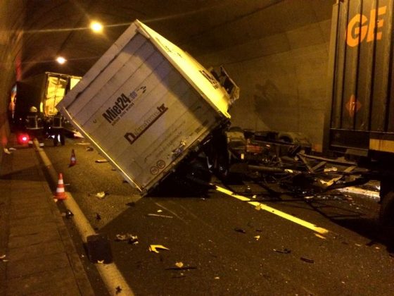 Po prvim neslužbenim podatcima do nesreće je došlo kada se kamionu Mercedes kojem se zapalila guma zaustavio u tunelu, nakon čega se iza njega zaustavio drugi kamion, da bi se trenutak kasnije u taj kamion punom brzinom zabio treći kamion.