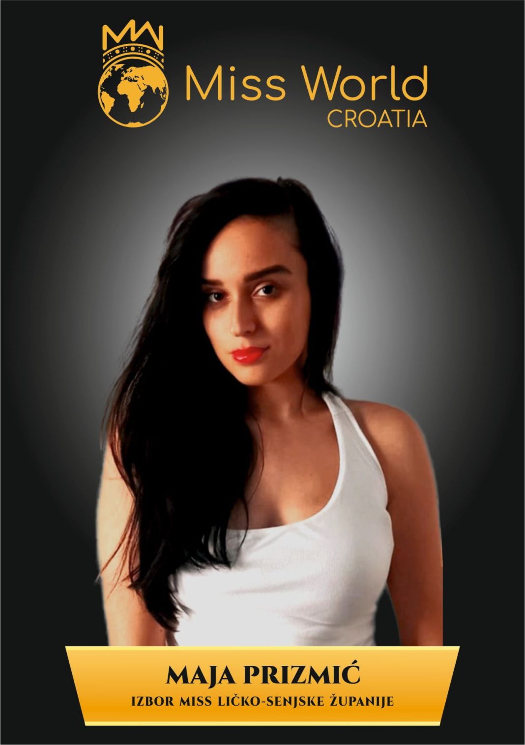 - MAJA PRIZMIĆ-Ima 20 godina, dolazi iz Senja i visoka je 173 centimetara. Završila je opću gimnaziju, a u Njemačkoj je stekla zvanje wellness terapeuta. Maja se natječe s ciljem da promovira ljepote i bogatu tradiciju svoje Ličko-senjske županije. Aktivno se bavila rukometom i plivanjem, a slobodno vrijeme najradije provodi u prirodi i bavi se slikarstvom, što joj je dugogodišnji hobi. Govori njemački, talijanski i engleski jezik.
