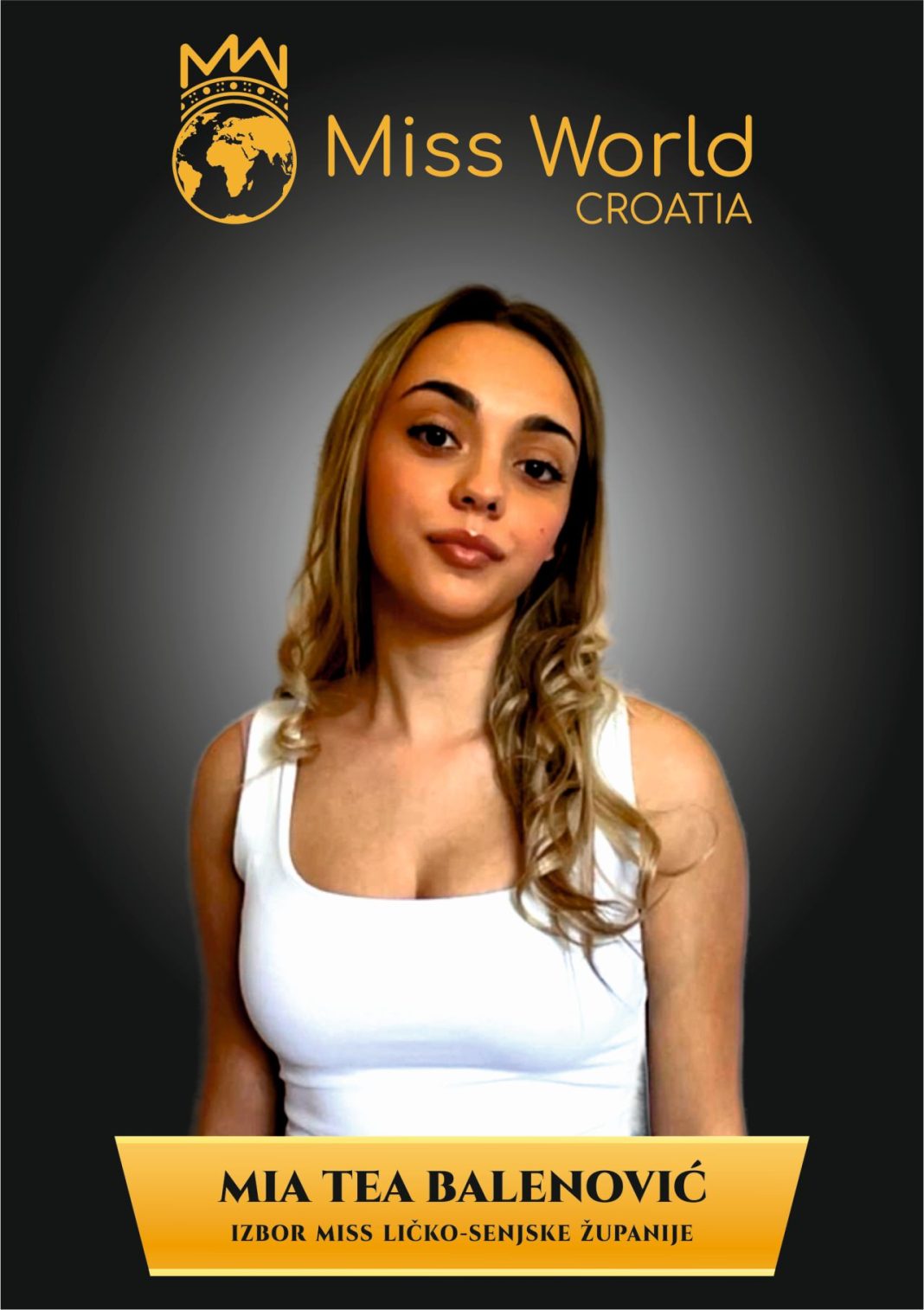 - MIA TEA BALENOVIĆ-Ima 17 godina, dolazi iz Smiljana i visoka je 165 centimetara. Pohađa četvrti razred Srednje škole za medicinske sestre/tehničare opće njege u Gospiću. Mia Tea voli čitati knjige i sudjeluje na nacionalnoj razini kviza “Mreža čitanja”. U slobodno vrijeme najviše voli planinariti i družiti se s prijateljima. Govori njemački jezik.