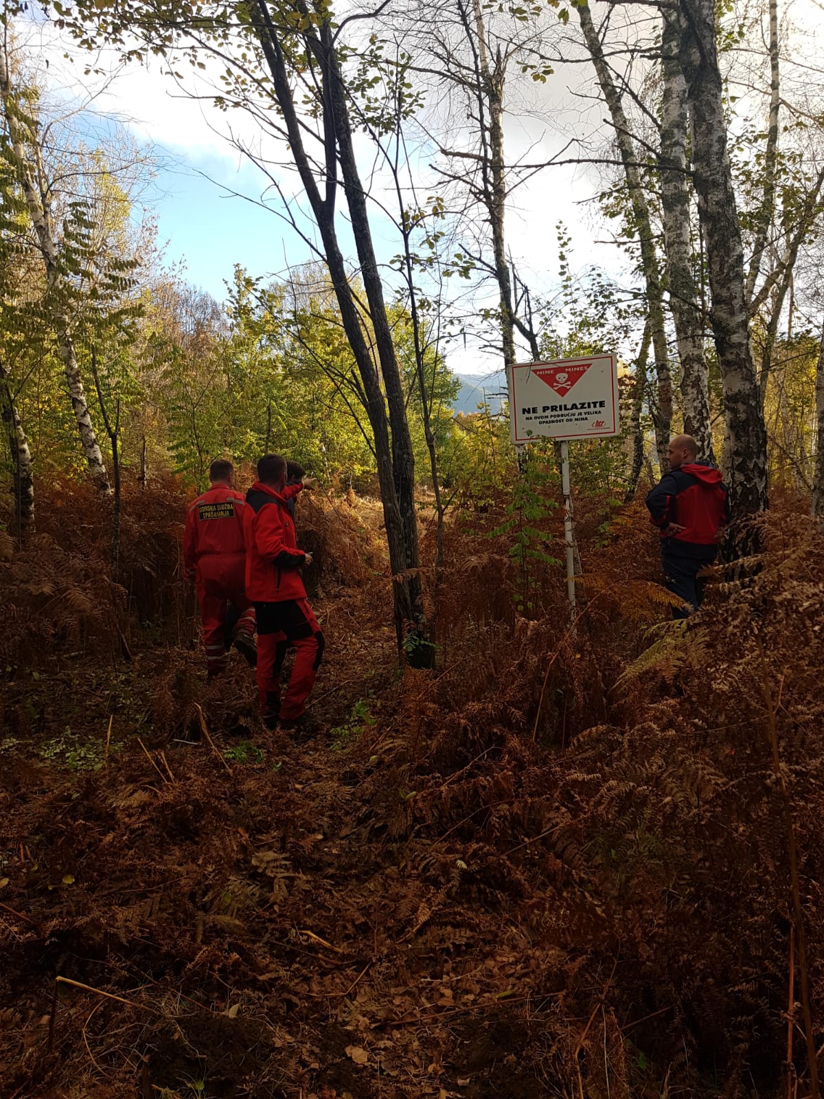 Nakon što smo provjerili stanje na adresi www.misportal.hcr.hr minirano područje unosimo u GPS uređaje kao poseban  (zabranjeni) sektor te započinjemo s pretragom ostalog terena oko traktora. Nimalo ugodno nije bilo  s jedne strane gledat crvene četvrtaste i trokutaste table s mrtvačkom glavom i natpisom MINE, a s druge strane razrušene kuće i vojne bunkere.  Vjerujemo dobivenim informacijama i svojim GPS uređajima i nadamo se da nemaju veća odstupanja. I prolazi tako prvi dan, potrage, 12 spašavatelja među kojima jedan potražni tim (čovjek i pas) i bespilotna letjelica, pretraživalo se uže područje oko traktora, prilazni putevi, razrušene i napuštene kuće i štale, snimalo se područje iz zraka. Iako rezultata nije bilo, sve jedno imamo razloga biti sretni jer svih 12 spašavatelja se u večernjim satima vraća u bazu.   Za ovaj dan posao još nije završen, ostalo je pregledati još nekoliko stotina fotografija snimljenih iz zraka ne bi li uočili traženu osobu.