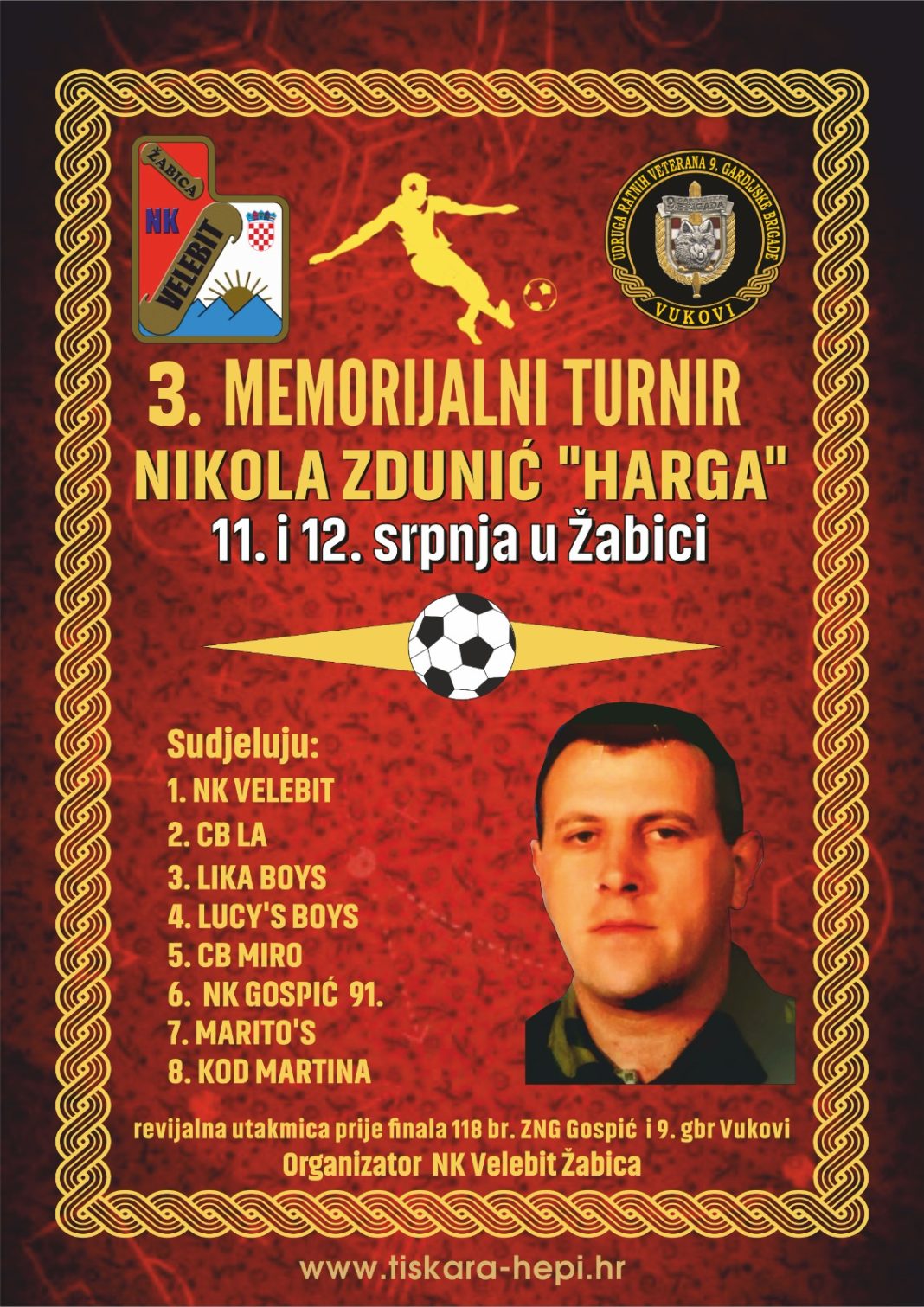 U Žabici će se 11. i 12. srpnja održati treći memorijalni turnir “Nikola Zdunić Harga”, u čast poginulom hrvatskom branitelju i pripadniku legendarne 9. gardijske brigade “Vukovi”. Turnir organizira NK Velebit Žabica, uz podršku Udruge ratnih veterana 9. gbr Vukovi.