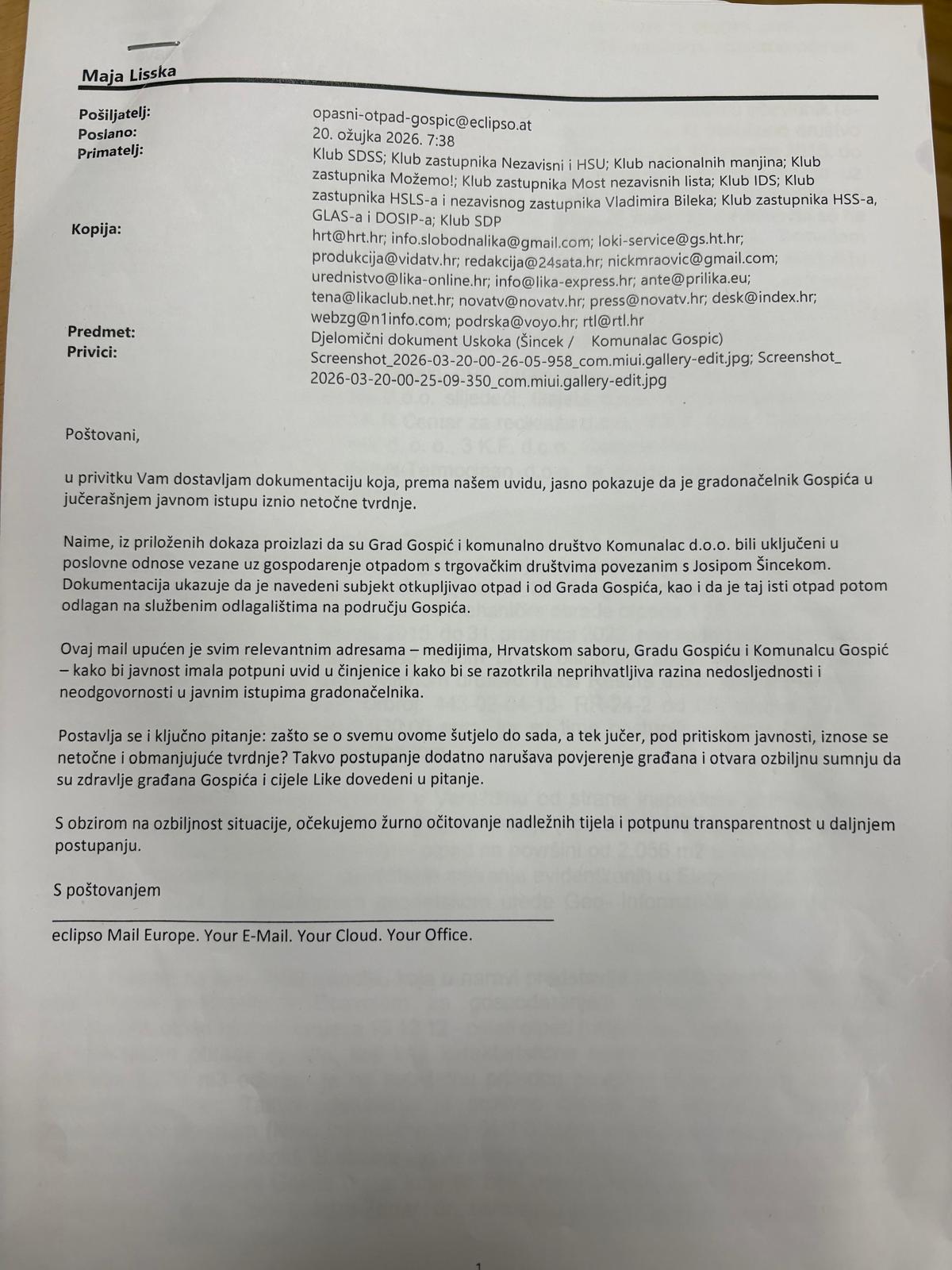„Informacija o otrovnom i opasnom otpadu u Lici jučer nije došla do javnosti, iako to nije nikakva lokalna, lička priča, nego pitanje od nacionalnog značaja. Iz podataka iz eONTO sustava proizlazi da su određeni subjekti – uključujući Gajeta d.o.o., Opću bolnicu Zabok, bolnicu hrvatskih veterana, Cezar, Komunalije Hrgovčić te Komunalac Gospić – predavali otpad društvu Tipos Resurs, odnosno Šinceku.