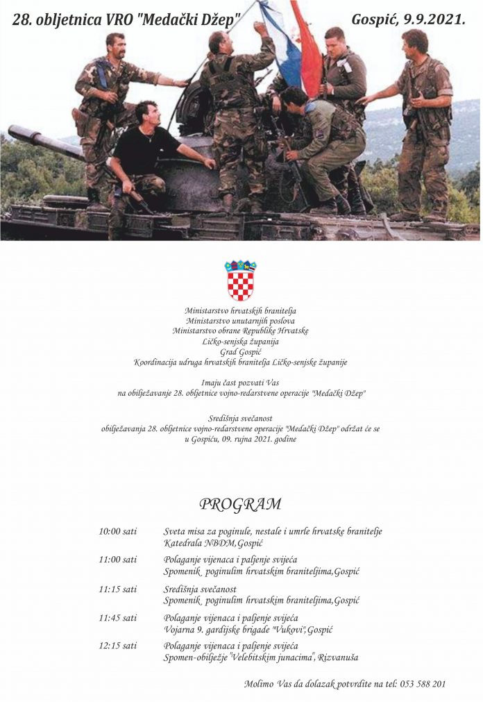 U četvrtak 09.09.2021.g. održati će se obilježavanje 28. obljetnice VRO “Medački Džep” u kojoj je oslobođeno oko 50 kilometara kvadratnih privremeno okupiranog teritorija RH te je neprijatelj udaljen od Gospića koji je dotad bio izložen stalnom granatiranju sa tog područja. Nažalost život je izgubilo 13 Hrvatskih vojnika i policajaca. Svečanost počinje u 10 sati Svetom misom u Katedrali NBDM u Gospiću.