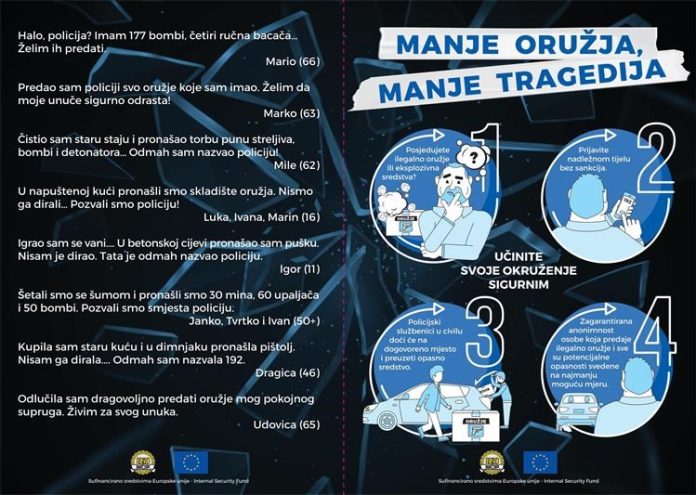 Također je važno naglasiti da građani ne donose oružje osobno u policijsku postaju ili upravu, kako ne bi došlo do njihovog aktiviranja i neželjenog ozljeđivanja, već da o tome obavijeste policiju na broj 192 te će stručni i osposobljeni policijski službenici doći na kućnu adresu prikupiti oružje.