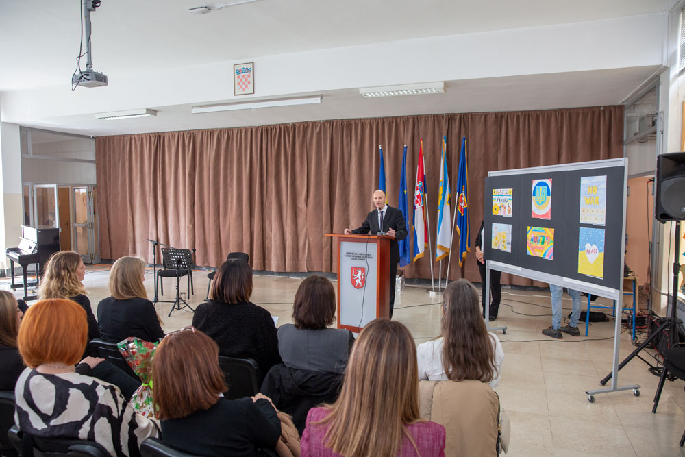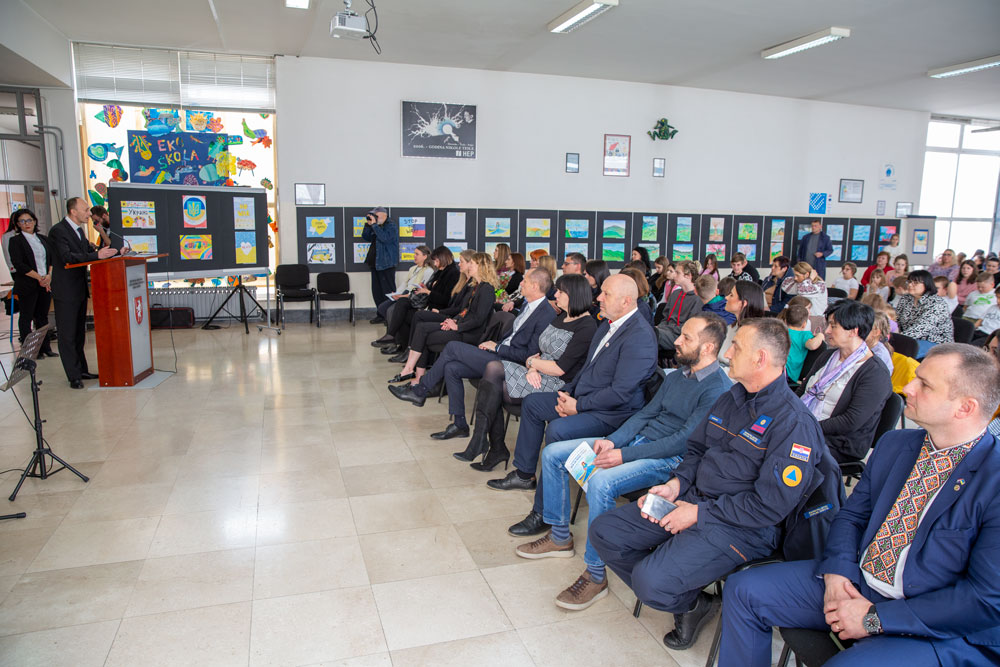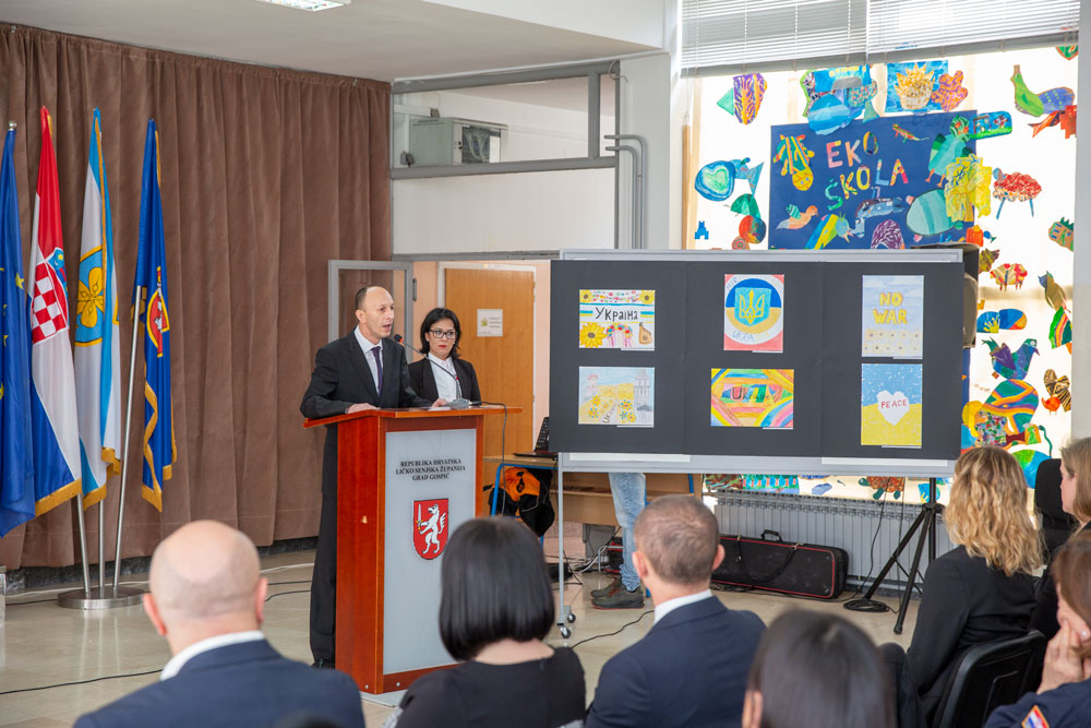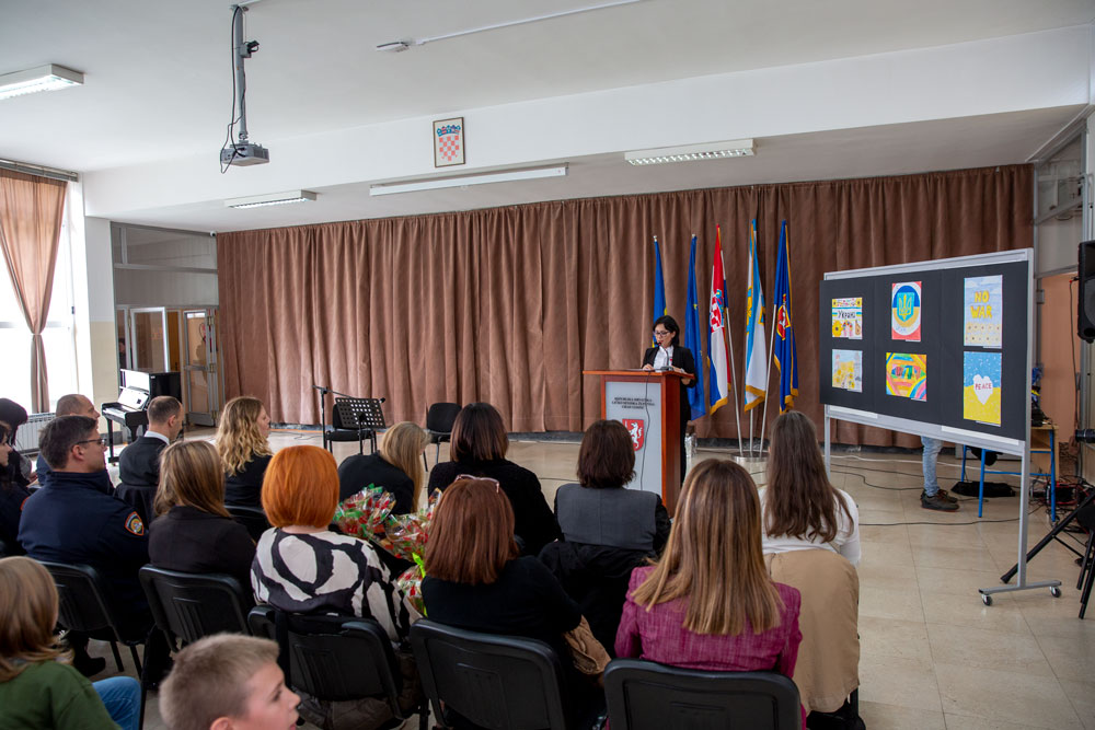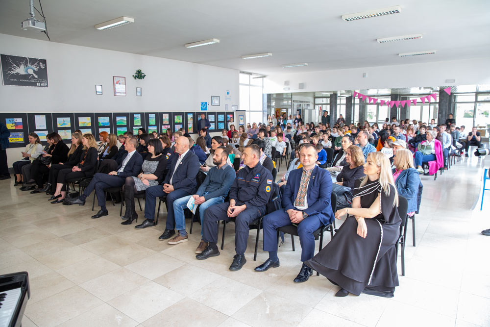 U holu gospićke osnovne škole bili su danas župan ličko-senjski Ernest Petry, zamjenica gradonačelnika Grada Gospića Kristina Prša, Kali Gasteiger iz političkog ureda Američkog veleposlanstva u Zagrebu, Joso Živković, voditelj Službe civilne zaštite, Vlado Brkljčić, direktor Županijskog Crvenog križa i Milan Mataija, predsjednik Kriznog stožera grada Gospić. U ulozi domaćina nazočne je najprije pozdravio ravnatelj škole Ivica Radošević rekavši kako je izuzetno ponosan što ovu školu pohađa 20 djece iz Ukrajine koja su se izvrsno uklopila u hrvatski škloski sustav. Autori ove izložbe su ukrajinska djeca u rasponu od 3,5 do 17 godina, a neki od tih učenika već su postizali izvrsne rezultate na školskim natjecanjima. Dokazala je to i Kira Matushyna na klaviru, djevojčica 5 razreda OŠ iz Korenice koja redovno putuje u Gospić kako bi nastavila pohađati glazbenu školu.
