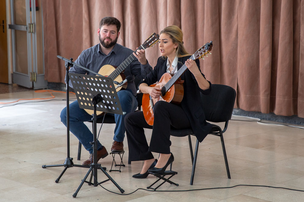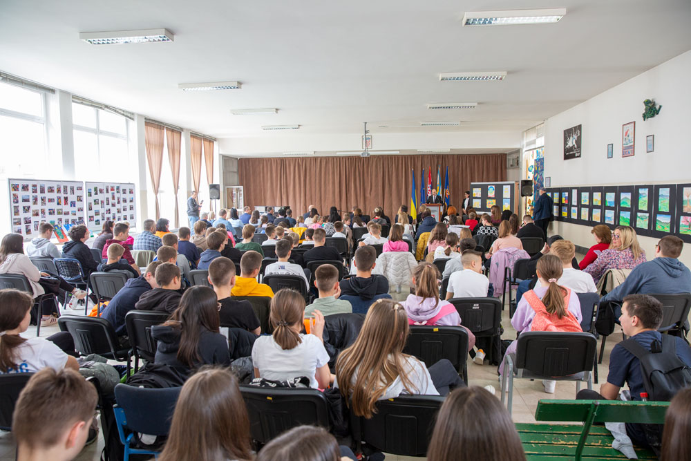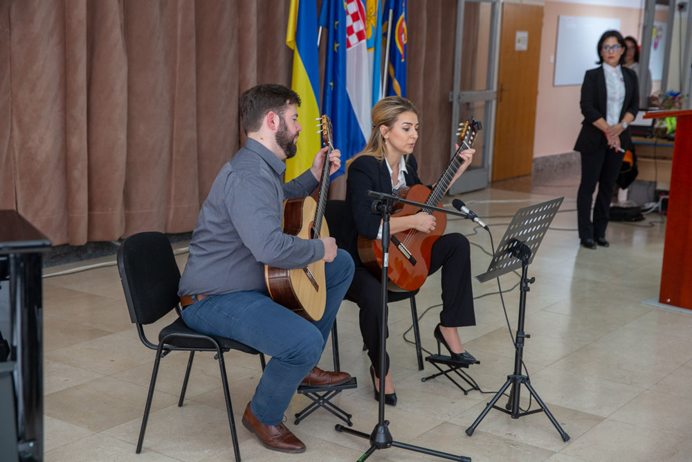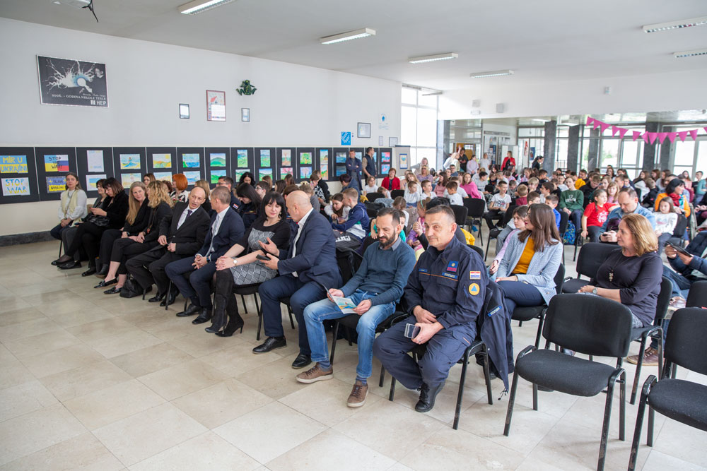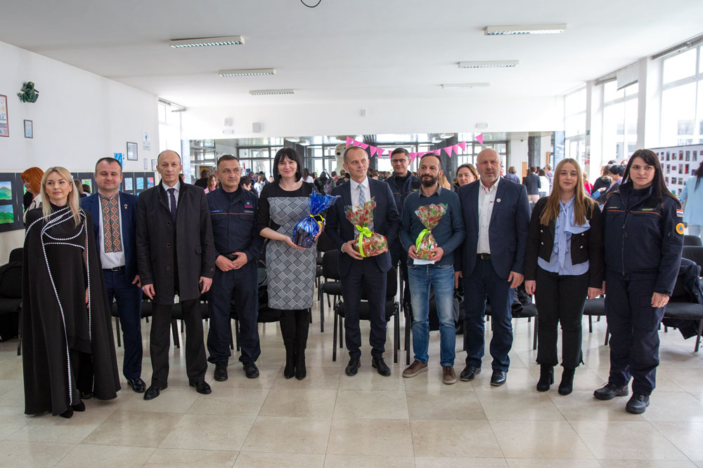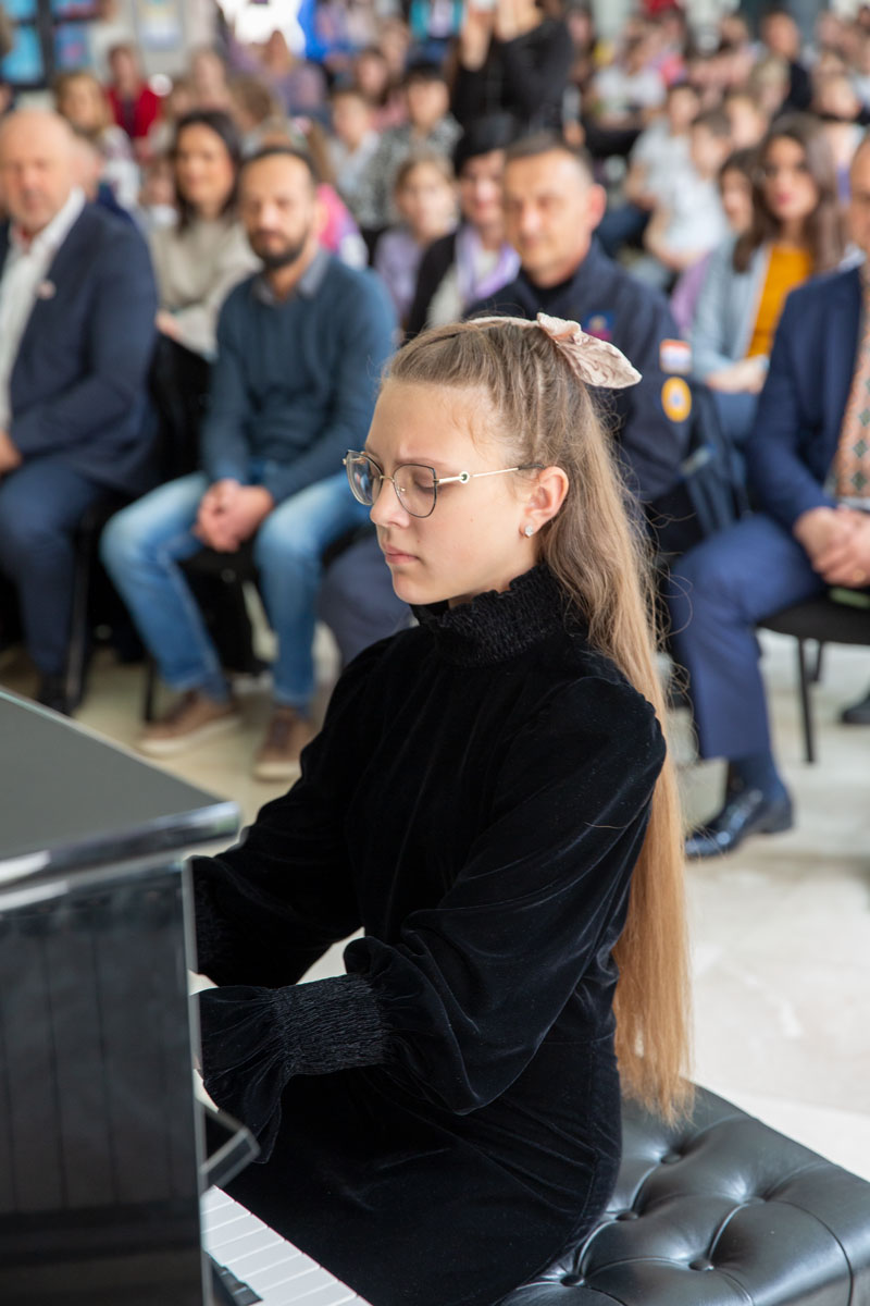 U holu gospićke osnovne škole bili su danas župan ličko-senjski Ernest Petry, zamjenica gradonačelnika Grada Gospića Kristina Prša, Kali Gasteiger iz političkog ureda Američkog veleposlanstva u Zagrebu, Joso Živković, voditelj Službe civilne zaštite, Vlado Brkljčić, direktor Županijskog Crvenog križa i Milan Mataija, predsjednik Kriznog stožera grada Gospić. U ulozi domaćina nazočne je najprije pozdravio ravnatelj škole Ivica Radošević rekavši kako je izuzetno ponosan što ovu školu pohađa 20 djece iz Ukrajine koja su se izvrsno uklopila u hrvatski škloski sustav. Autori ove izložbe su ukrajinska djeca u rasponu od 3,5 do 17 godina, a neki od tih učenika već su postizali izvrsne rezultate na školskim natjecanjima. Dokazala je to i Kira Matushyna na klaviru, djevojčica 5 razreda OŠ iz Korenice koja redovno putuje u Gospić kako bi nastavila pohađati glazbenu školu.