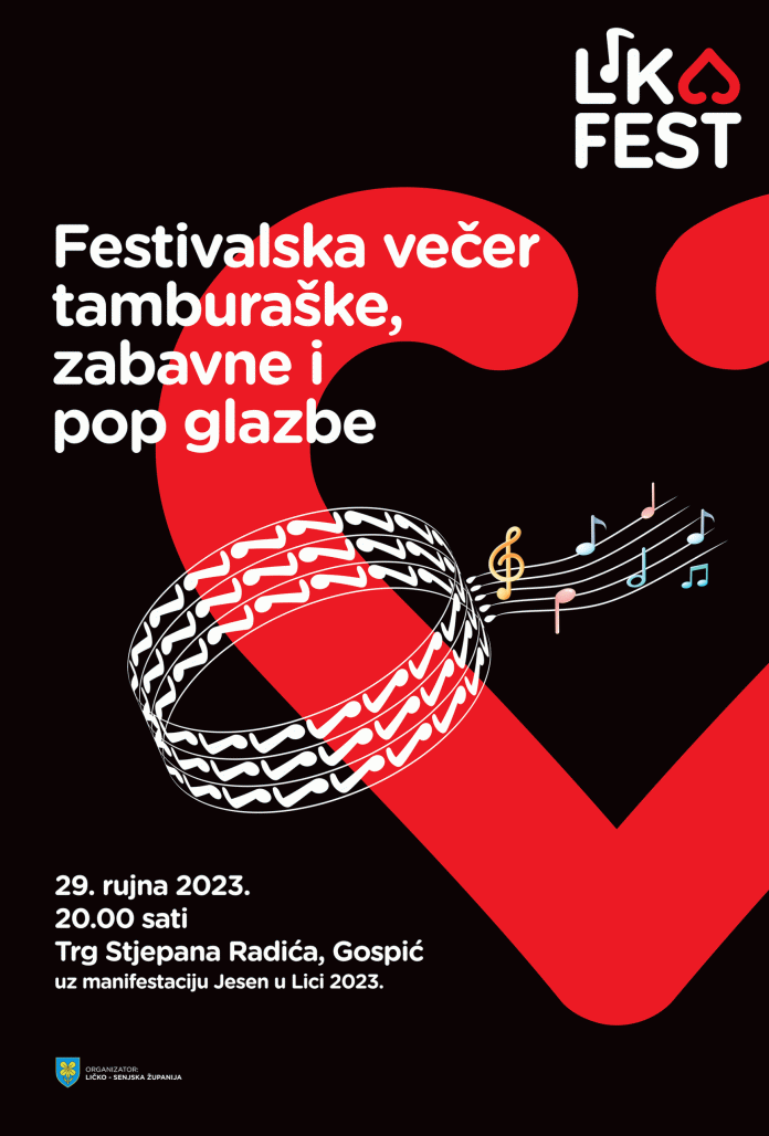 Trg Stjepana Radića u Gospiću postat će centar zabave u petak, 29. rujna od 20 sati, kada će ugostiti festival tamburaške, zabavne i pop glazbe pod nazivom 1. “LIKA FEST 2023.” Festival će okupiti niz izvođača iz Hrvatske, ali i iz Bosne i Hercegovine.