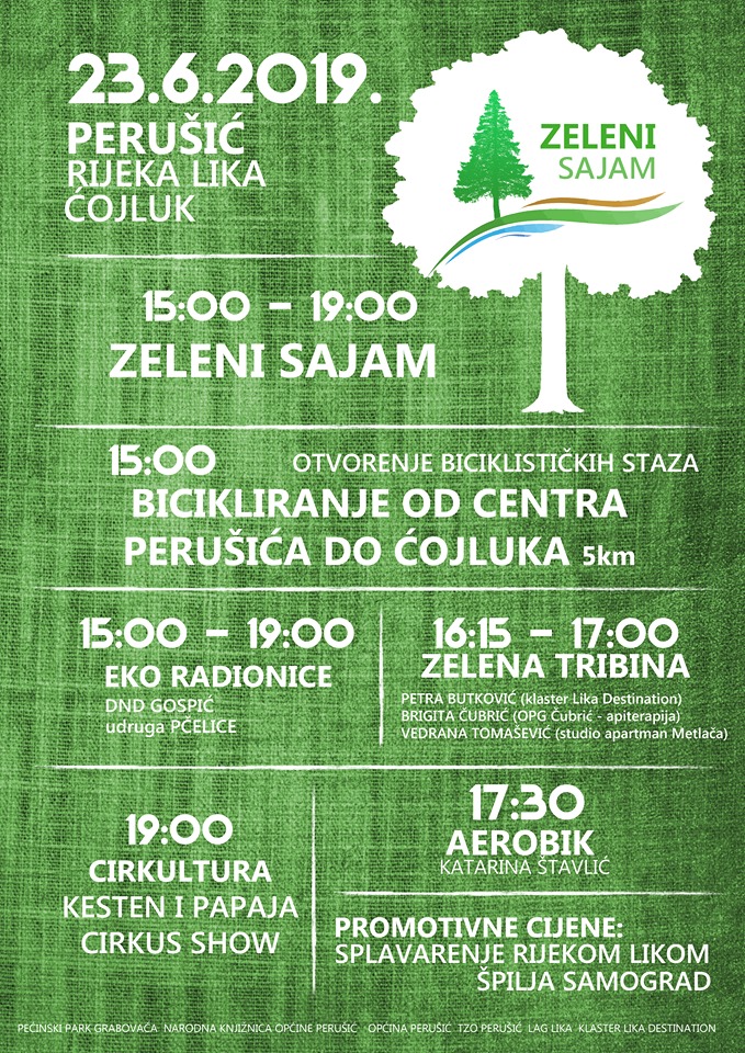 U nedjelju 23.6.2019. godine s početkom u 15:00 sati, na rijeci Lici (lokacija Ćojluk) u Perušiću održat će se drugi po redu Zeleni sajam. Na zelenom sajmu moći će se kupiti razni domaći proizvodi i proizvodi regionalnog brenda Lika Quality poput meda, rakije, mliječnih proizvoda i ostali prehrambeni proizvodi, kao i razne rukotvorine i prigodni suveniri. Zelena tribina opravdat će svoj naziv. U prirodnom, rustikalnom ambijentu zanimljivim govornicima svi zainteresirani moći će postavljati pitanja vezana uz turizam, zaštićena područja i obiteljska poljoprivredna gospodarstava. Želite se početi baviti iznajmljivanjem ili pak prodavati svoje domaće proizvode, dođite i saznajte kako!