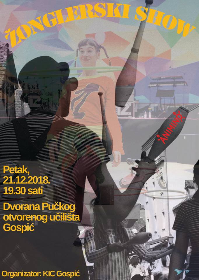 U sklopu Prosinca u Gospiću, u petak (21.12.2018.) s početkom u 19.30 sati u dvorani Pučkog otvorenog učilišta Gospić održat će se Žonglerski show kreativnog tima Animino. Četiri performera izvode ludo zabavni cirkuski spektakl; žongliranje lopticama, čunjevima, hula hoopom, manipulacija prozirnom kuglom, vožnja monociklom te razno razne akrobacije. Nakon žonglerskog showa slijedi žonglerska radionica u kojoj mogu sudjelovati svi zainteresirani.