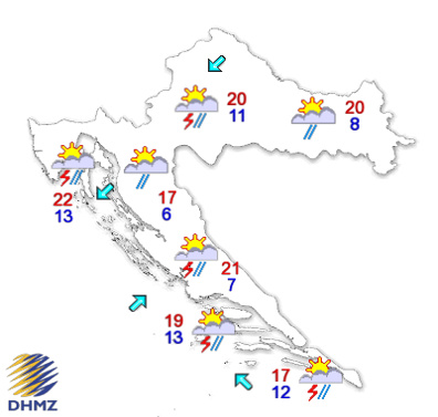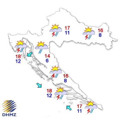 Promjenljivo oblačno, povremeno s kišom, ponegdje i pljuskovima s grmljavinom. Vjetar u unutrašnjosti uglavnom slab, na Jadranu ujutro bura i istočnjak, danju zapadnjak i sjeverozapadnjak, na jugu jugo. Najniža jutarnja temperatura između 6 i 12, na Jadranu od 10 do 14, a najviša dnevna uglavnom između 14 i 19 °C.