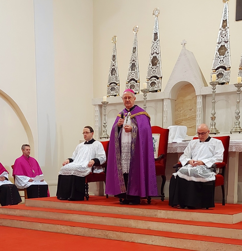 Biskup se u propovijedi najprije osvrnuo na titule kanonika koje su počasne titule za neke svećenike biskupije koji su prepoznati po posebnoj zauzetosti u svećeničkom pastoralu i u promicanju evanđeoskih vrijednosti na planu biskupije, kao izričaj posebne zahvalnosti i poziv da nastave u toj zauzetosti na svim razinama života naše biskupije. „Ova služba podjeljuje se svećenicima koji su desetljećima zauzeto radili u različitim službama mjesne Crkve te ostavili neizbrisivi trag. Prorok Jeremija u kratkom čitanju kaže: ‘Sjeti se kako stajah pred licem tvojim, da u tebe milost tražim za njih, da odvratim od njih jarost tvoju’. Svećenik je osoba molitve i pozvan je svakodnevno prikazivati molitvu za povjereni mu narod. Jeremija moli Gospodina da odvrati jarost svoju zbog grijeha naroda. Na isti način to čini i Mojsije. Bog ne ostaje gluh na ove molitve jer svećenik je čovjek molitve. Može se završiti teološki studij i biti teolog, ali ako je netko samo teolog bez molitve i oslanja se samo na svoj ratio, takva teologija nema svoj smisao. Može netko jako puno raditi a ne moliti. Takva osoba predstavlja samo sebe. Može netko jako puno moliti a ne raditi. I tu možemo reći da je takvo nešto uzaludno. Molitelj mora biti onaj koji će i djelima nešto pokazati“. Biskup Križić homiliju je završio citatom pape Franje iz Evangelii gaudium: „Duhom ispunjeni evangelizatori jesu blagovjesnici koji mole i rade. Mistične predodžbe bez čvrstog društvenog i misionarskog dosega nisu od pomoći evangelizaciji, niti disertacije ili društvene ili pastoralne prakse kojima nedostaje duhovnost koja može promijeniti srca. Ovi jednostrani i nepotpuni prijedlozi dopiru do samo nekoliko skupina i pokazuju se nesposobnima za zračenje izvan njih jer ograničavaju Evanđelje. Ono što je potrebno jest sposobnost njegovanja unutarnjeg prostora koji može dati kršćanski smisao zalaganju i djelovanju. Bez produljenih trenutaka klanjanja, molitvenog susreta s Riječju, iskrenog razgovora s Gospodinom, naš rad lako postaje besmislen; gubimo energiju kao posljedicu umora i poteškoća, a naš žar nestaje. Crkva ima prijeku potrebu za dubokim dahom molitve i neizmjerno me veseli što je sve više zajednica posvećenih molitvi i zagovoru, molitvenom čitanju Božje riječi i trajnom klanjanju Euharistiji. Ipak, “moramo odbaciti napast da ponudimo privatiziranu i individualističku duhovnost koja nije u skladu sa zahtjevima milosrđa, a ne samo s logikom utjelovljenja”. Uvijek postoji rizik da neki trenuci molitve mogu postati isprika za nenuđenje života u misiji; privatizirani stil života može navesti kršćane da potraže utočište u nekim lažnim oblicima duhovnosti“.