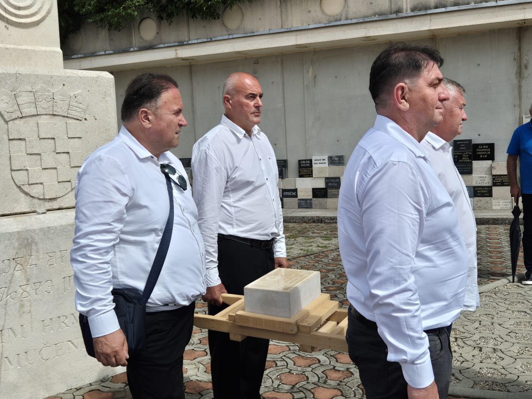 Spomen-ploča nosi posebnu simboliku jer je izrađena od kamena iz Peruće, koju su pobunjeni Srbi tijekom operacije Maslenica minirali u znak odmazde.