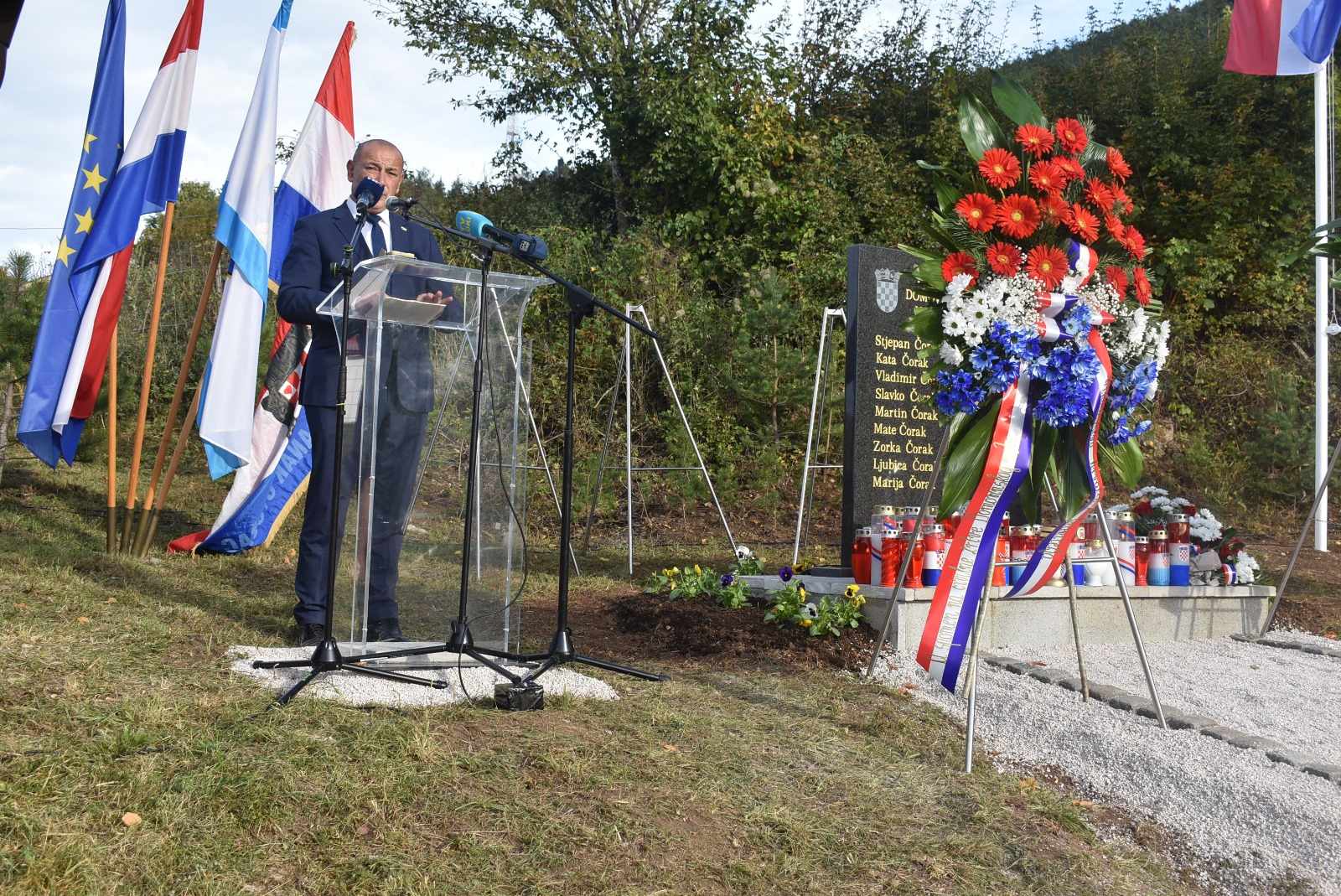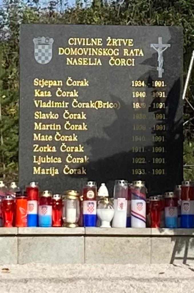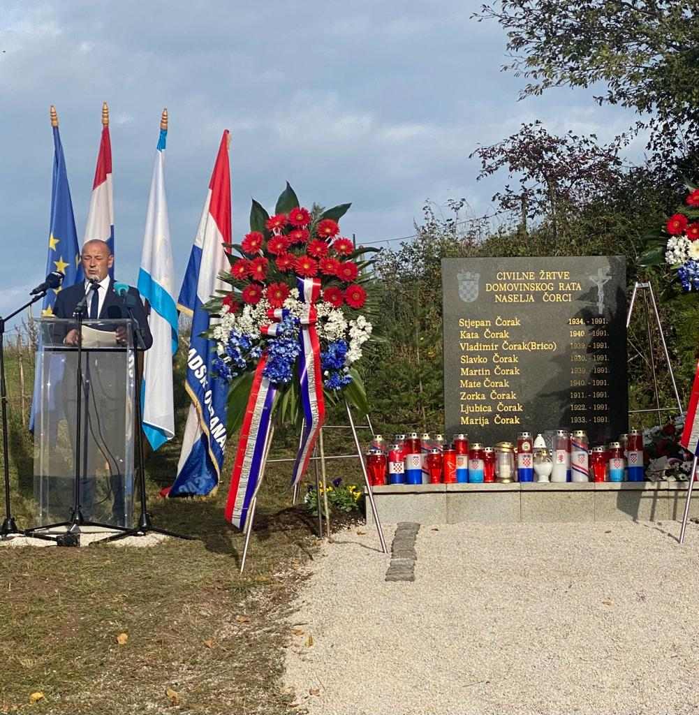 -Pozdravljam vas u ime našeg premijera Andreja Plenkovića i u svoje osobno. Svako tko zna što se prije 32 godine dogodilo ovdje u Čorcima osjeća tugu i bol za svakim izgubljenim životom. Te su žrtve prošle neshvatljive torture samo zato jer su bili Hrvati. Želim iskazati zahvalu Draženu Kostelcu i svima koji su potaknuli ostvarivanje ove ideje i otimanja zaboravu ove ratne strahote. Ovo spomen-obilježje jedno je od mnogih podignutih civilnim žrtvama i trajni podsjetnik na besmislenost zločina nad civilnim stanovništvom u Domovinskom ratu. Svi ovi civili ubijeni su u jesen 1991. godine u zaseoku Čorci. Imena žrtava su podsjetnik svima koji se ovdje zateknu. Da se ne zaboravi i nikada više ne ponovi. Ovamo najviše dolazi rodbina žrtava, ali vjerujem da će ubuduće u zaseok Čorci dolaziti mnogi i odavati počast ubijenim žrtvama. Ovdje treba dolaziti što više ljudi, s jasnim ciljem: pokloniti se ovim nedužnim žrtvama. Ovamo trebaju doći i oni koji ne znaju povijesne istine i činjenice o stvaranju Hrvatske.