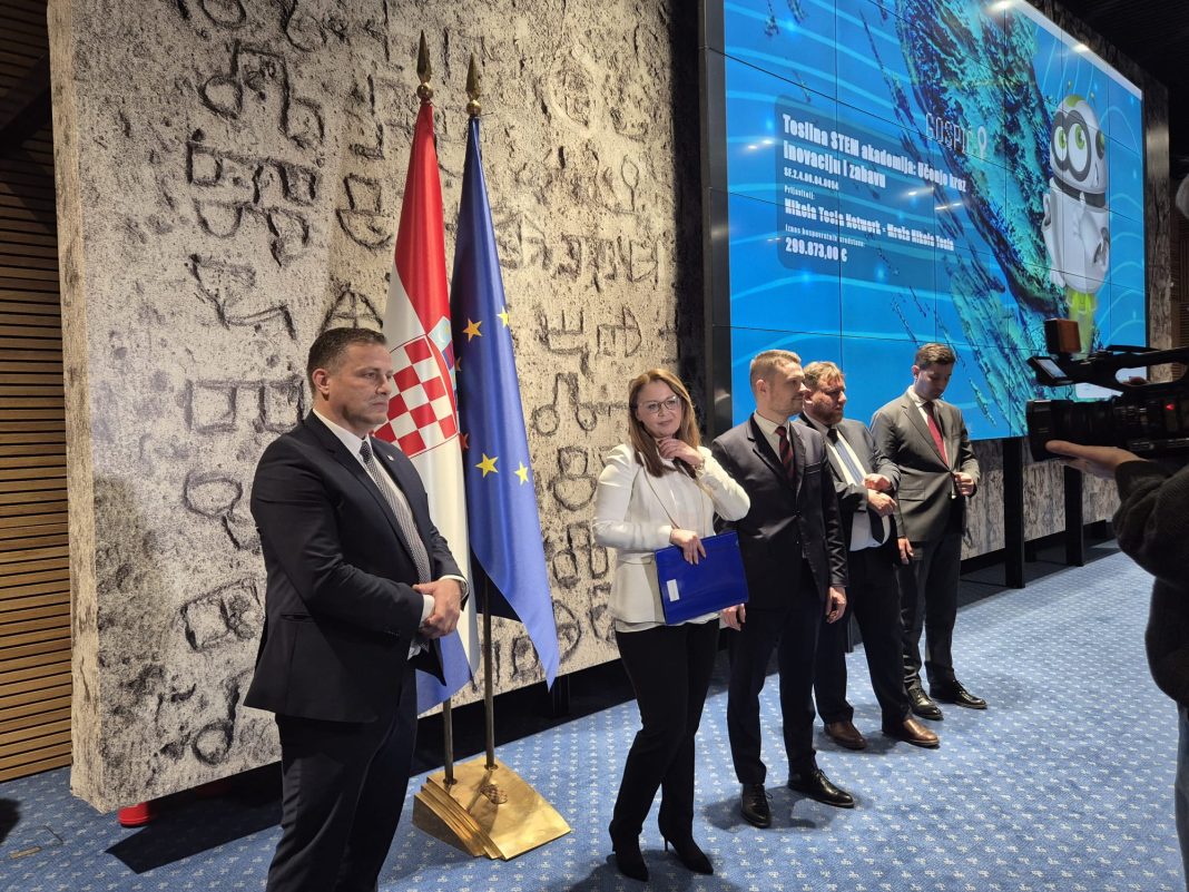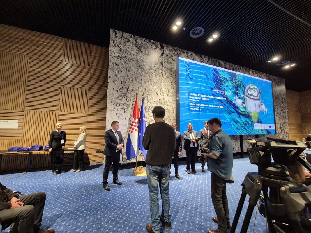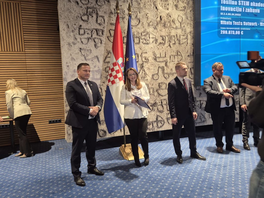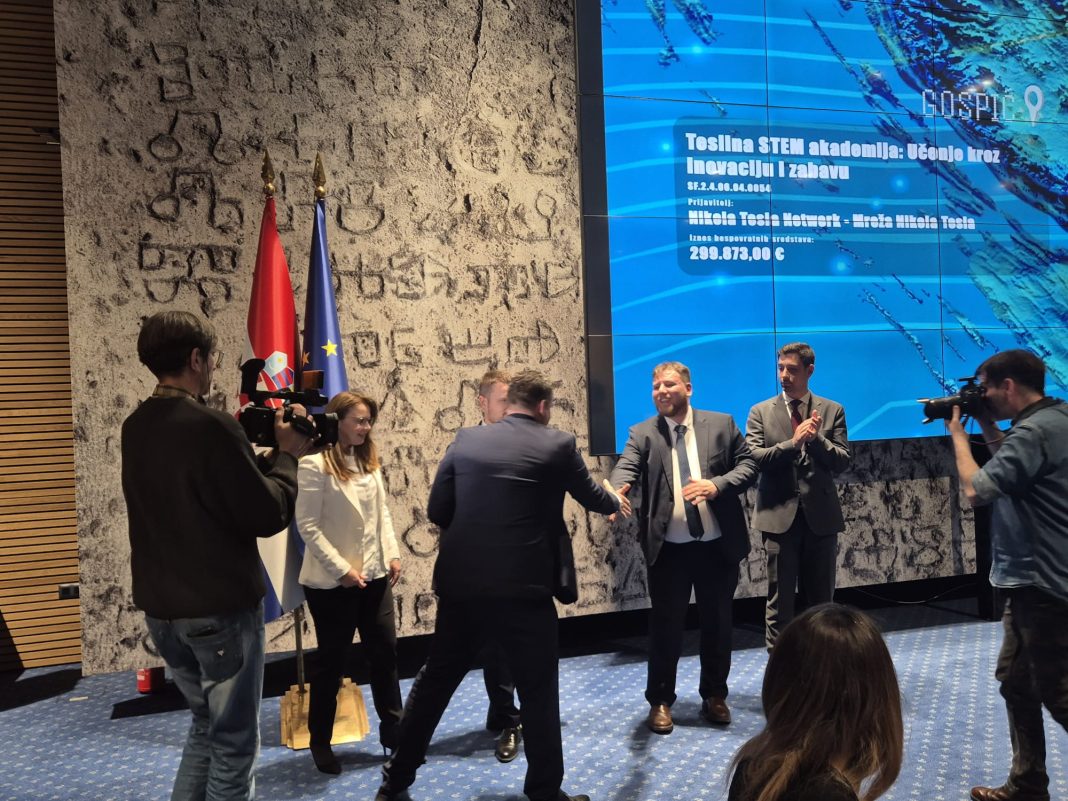 Predstavnici udruge Nikola Tesla Network Ivan Radošević, predsjednik udruge i Martina Furdek Hajdin, zamjenica predsjednika jučer su sudjelovali na svečanosti dodjele ugovora u okviru poziva „Jačanje kapaciteta organizacija civilnog društva za promociju STEM-a“.sa projektom Teslina STEM akademija, učenje kroz inovaciju i zabavu