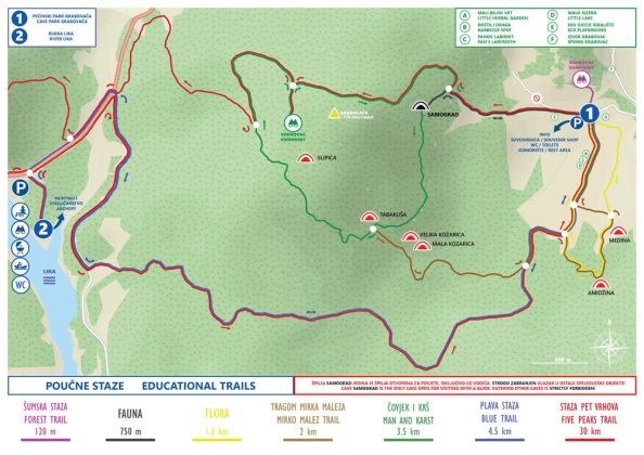 U sklopu aktivnosti obogaćivanja turističke ponude Pećinskog parka Grabovača, Javna ustanova je uredila novu poučnu stazu pod nazivom „Plava staza“. Plava staza duga je 4,5 km, a povezuje Pećinski park Grabovaču i rijeku Liku. Staza nije tehnički ni kondicijski zahtjevna i šetnja traje oko sat i pol uz pauze za fotografiranje te je idealna za ugodnu obiteljsku šetnju. Staza je obogaćena edukativnim panoima koji su tematski posvećeni šumama, tlu i krškom reljefu. Ova staza oduševit će sve ljubitelje šume jer cijelim putem prolazi podno visokih krošnji te je stoga odličan izbor i za ljetne šetnje.