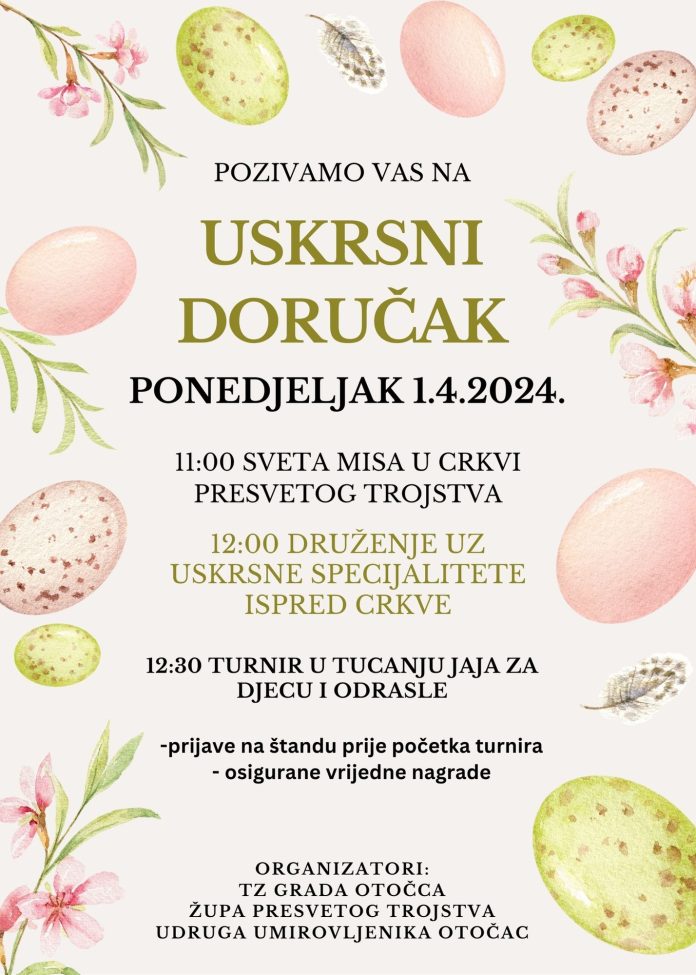 Turistička zajednica Grada Otočca, Župa Presvetog Trojstva i udruga umirovljenika iz Otočca po prvi put organiziraju Uskrsni doručak koji će se održati na Uskrsni ponedjeljak 1. 4. 2024. godine u 12,00 sati ispred crkve, a nakon svete mise.
