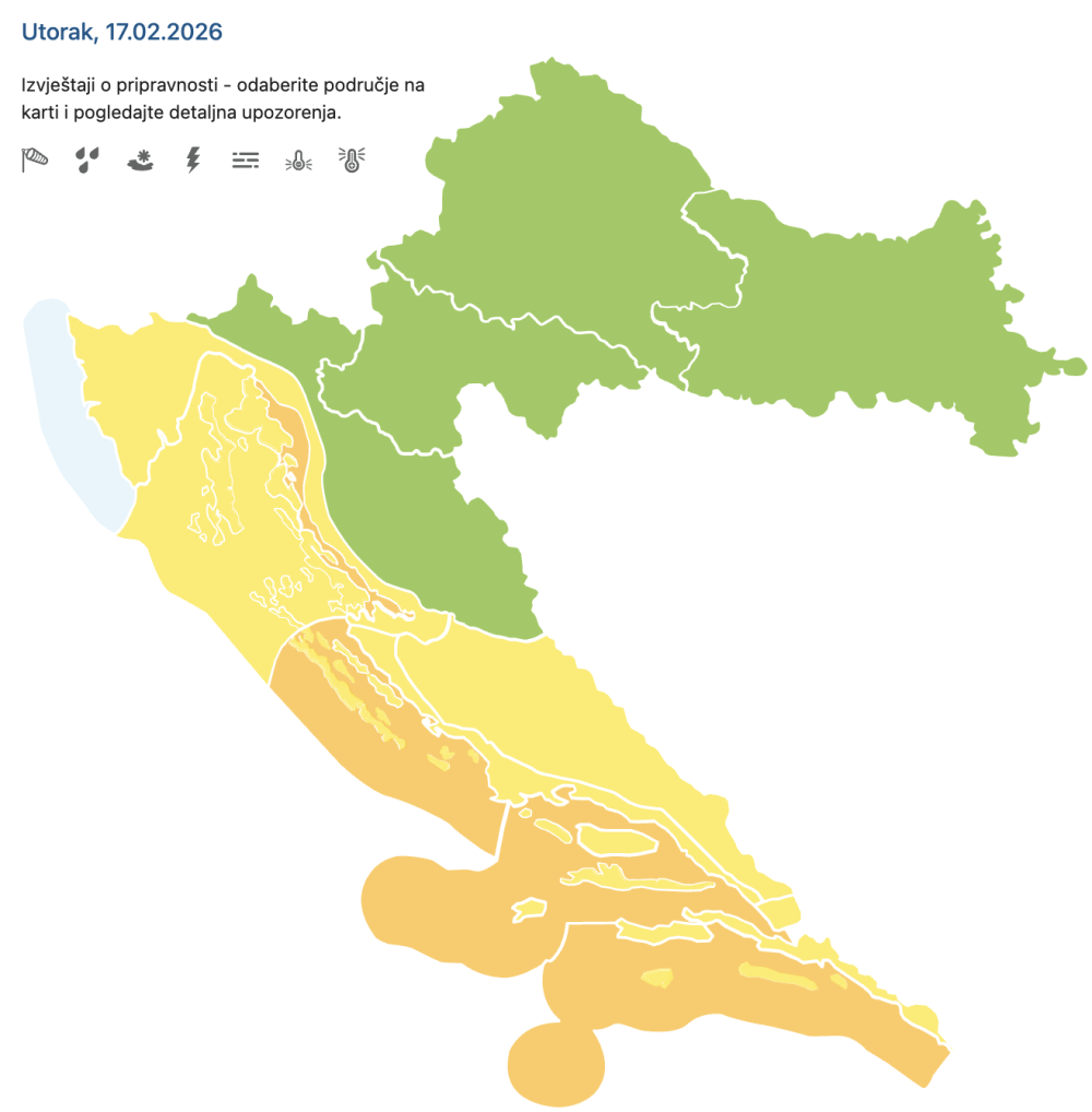 U Dalmacija će najviše kiše pasti tijekom noći, lokalno i uz grmljavinu. Tijekom utorka razvedravanje će krenuti sa sjevera pa će poslijepodne prevladavati sunčano vrijeme. Vjetar će biti umjeren do jak, uz moguće olujne udare bure, tramontane i sjeverozapadnjaka. More će biti umjereno valovito do valovito, a prema otvorenom i jače valovito. Jutarnje temperature kretat će se od 3 °C u unutrašnjosti do 9 °C na otocima, dok će dnevne dosezati između 10 i 14 °C.