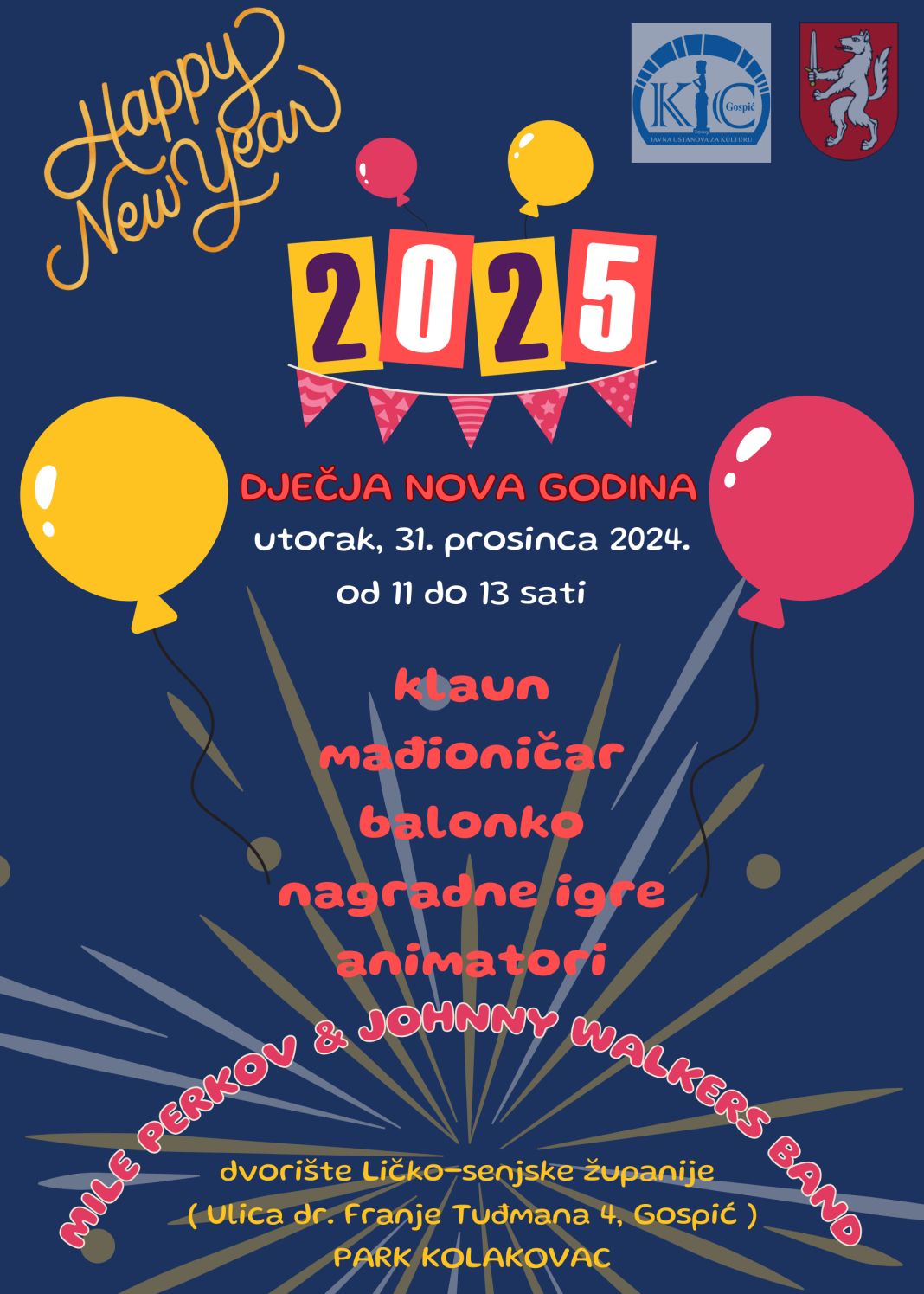 Grad Gospić i KIC Gospić organiziraju Dječji doček Nove godine u utorak, 31. prosinca u dvorištu Ličko – senjske županije (Ulica dr. Franje Tuđmana 4, Gospić, Park Kolakovac – otvoreno klizalište) s početkom u 11 sati. Uz glazbeni program Mile Perkova i Johnny Walkers benda, program dočeka upotpunit će dječji animatori, mađioničar, balonko i klaun. Najmlađe očekuju pjesma, ples, prigodne igre kao i brojna druga iznenađenja. Dovedite svoje mališane na veliki raspjevani i rasplesani ispraćaj stare i doček Nove godine.