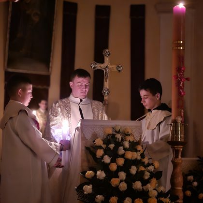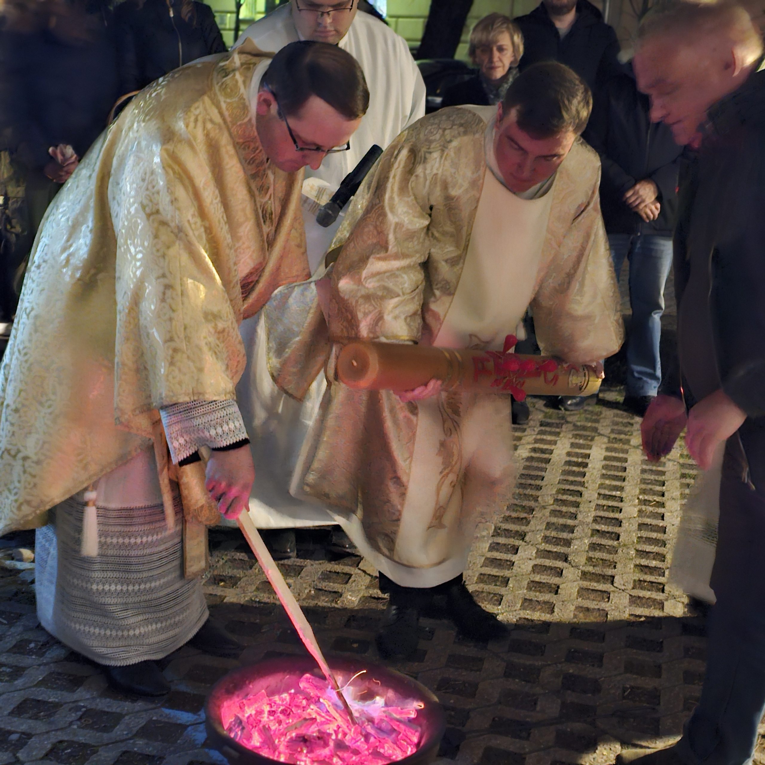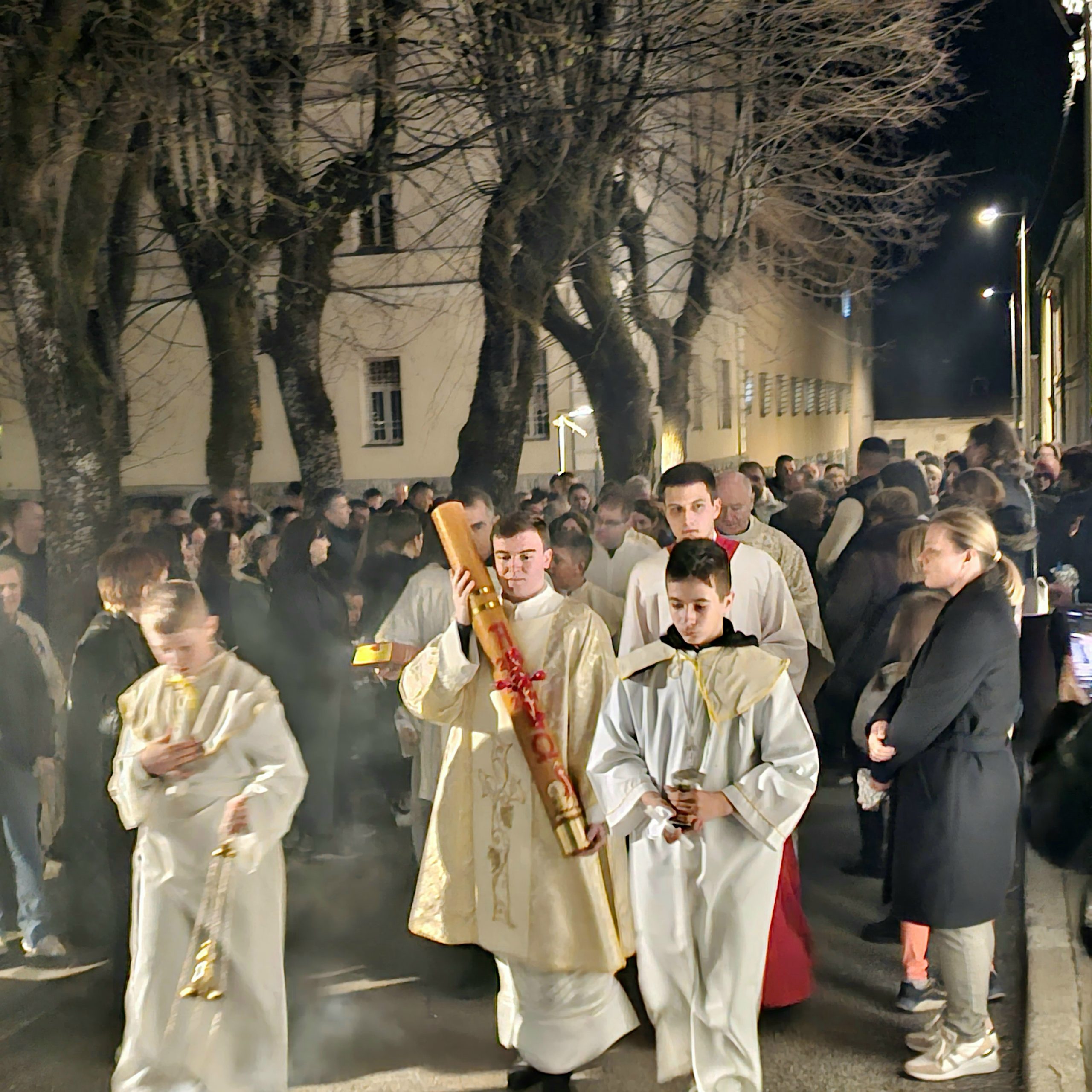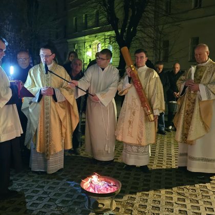 Predvodio ga je s kancelarom Mišel Grgurić, u zajedništvu sa župnikom o. Antom Kneževićem i đakonom vlč. Karlom Špoljarićem Posluživao je brat Boško Roguljić, bogoslov Marko Butković s ministrantima. U parku kraj katedrale, uz zapaljen oganj počela je liturgija svijetla. Nakon blagoslova ognja upaljena je uskrsna svijeća koju je đakon Špoljarić u procesiji unio u mračnu katedralu pjevajući tri puta „Svijetlo Kristovo“, a svijetlo se širilo i pojačavalo paljenjem svijeća vjernika. Slijedio je Vazmeni hvalospjev i Služba riječi.