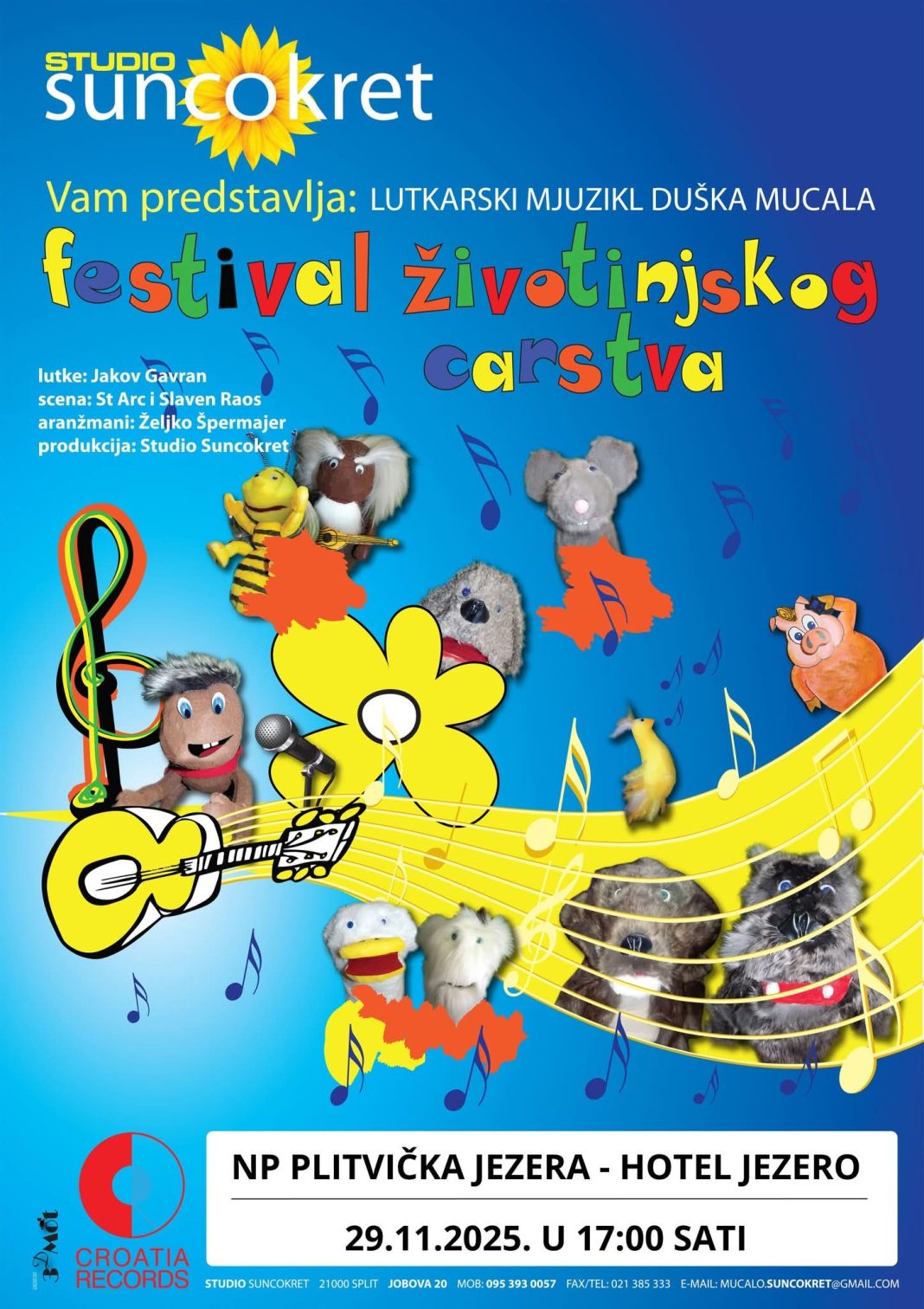 U sklopu adventskih događanja na području Nacionalnog parka Plitvička jezera, ove subote 29. studenog 2025. u 17 sati u hotelu Jezero održat će se dječja lutkarska predstava i mjuzikl „Festival životinjskog carstva“ u produkciji Studija Suncokret. Predstava je nastala prema ideji i tekstu Duška Mucala, uz sudjelovanje poznatih lutkara i glumaca, a donosi razigranu priču iz svijeta životinja, ispunjenu glazbom, humorom i poučnim porukama.