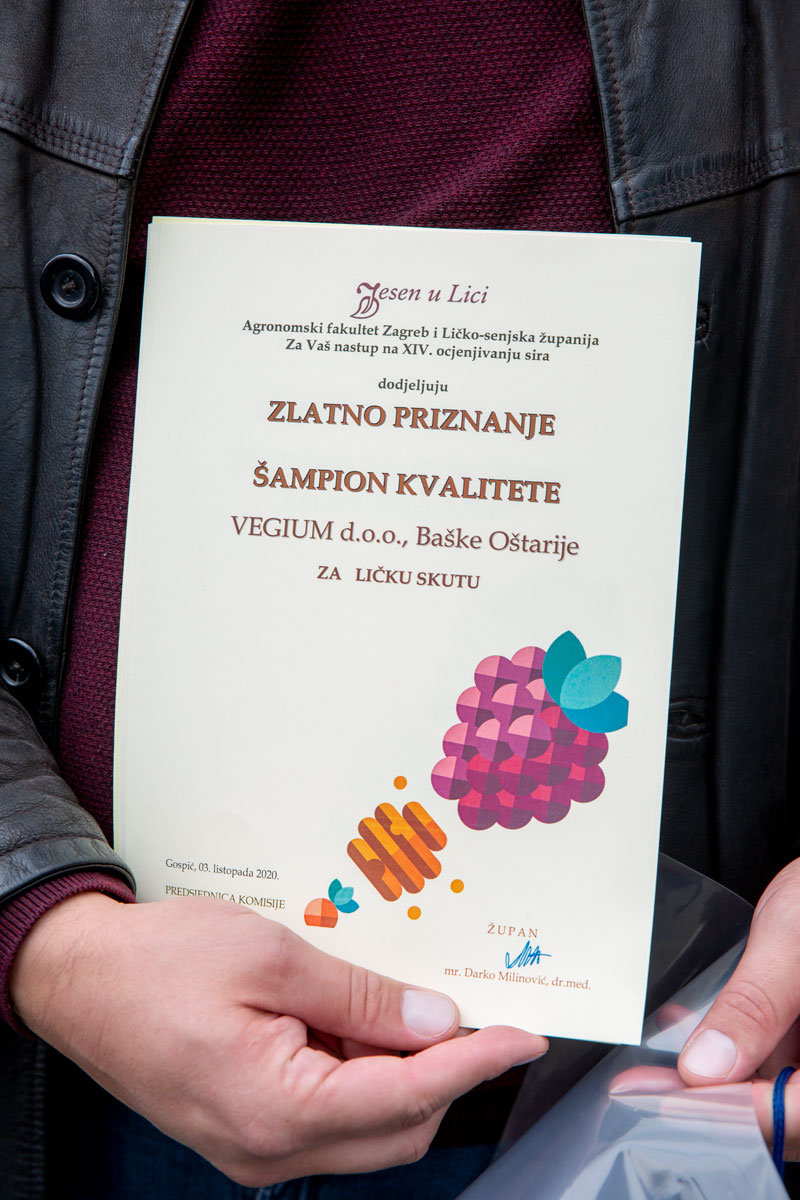Agronomski fakultet Zagreb i Ličko-senjska županija za XIV. ocjenjivanje sira dodijelio je ZLATNO PRIZNANJE i ŠAMPION KVALITETE sirani VEGIUM d.o.o., Baške Oštarije za Ličku skutu.