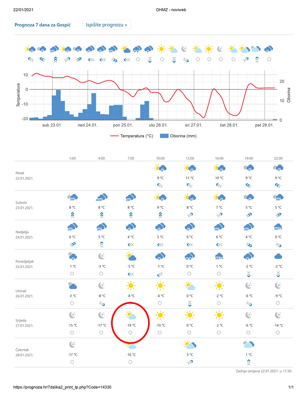 Promjenljivo, ponegdje i pretežno oblačno s mjestimičnom kišom, češćom i lokalno obilnom na Jadranu i uz njega. Duž obale povremeno može i zagrmjeti, a u drugom dijelu dana uz pad temperature kiša će u višem gorju prijeći u susnježicu i snijeg. I dalje razmjerno vjetrovito uz umjeren do jak jugozapadni i južni vjetar, u gorju i na Jadranu mjestimice s olujnim udarima. Najniža temperatura zraka od 5 do 10, na Jadranu od 9 do 13, a najviša dnevna uglavnom od 10 do 15 °C, u drugom dijelu dana u gorju te na sjevernom Jadranu malo niža.