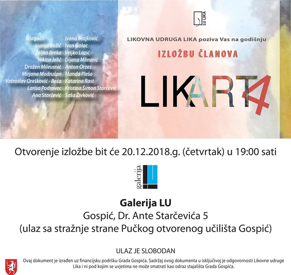 Pozivamo Vas na otvorenje zajedničke izložbe članova Likovne udruge Lika LikArt4, koje će se održati u četvrtak 20.12.2018.g. s početkom u 19:00 sati u Galeriji LU, Pučko otvoreno učilište “Dr. Ante Starčević” Gospić.