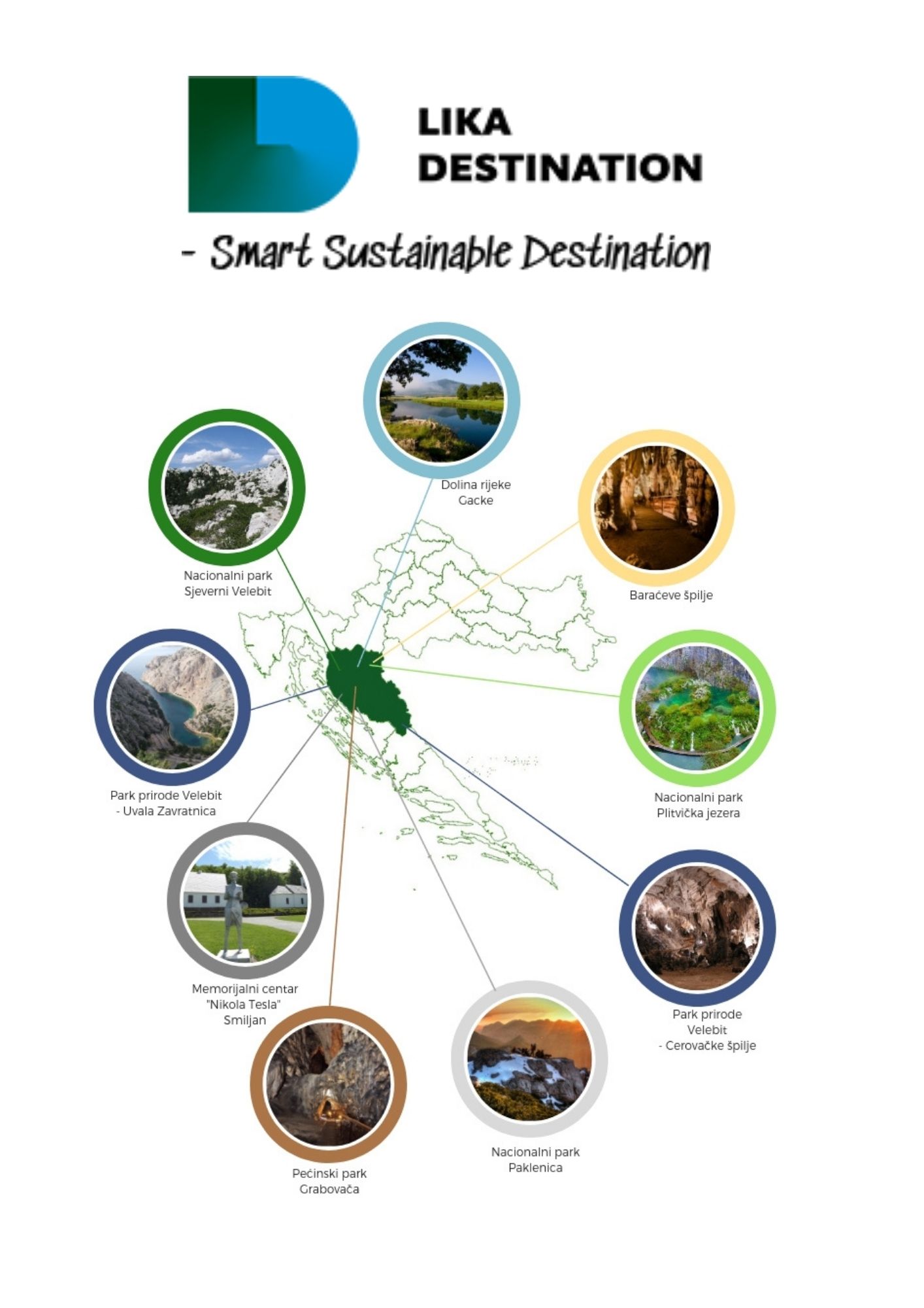 Upravo ono što destinaciju Lika izdvaja i čini jedinstvenom je činjenica da se u njoj osim Nacionalnog parka Plitvička jezera, kao jednog od najpoznatijeg nacionalnog parka u svijetu i najposjećenijeg nacionalnog parka u Hrvatskoj nalaze i Nacionalni park Paklenica, Nacionalni park Sjeverni Velebit, Park prirode Velebit, Pećinski park Grabovača, Baraćeve špilje te dolina rijeke Gacke u kojoj se nalazi Hrvatski centar za autohtone vrste riba i rakova krških voda. Uz sva navedena zaštićena prirodna područja moramo naglasiti i kako je destinacija Lika rodno mjesto svjetski poznatog genija Nikole Tesle, u čijoj se rodnoj kući u Smiljanu danas nalazi istoimeni Memorijalni centar.