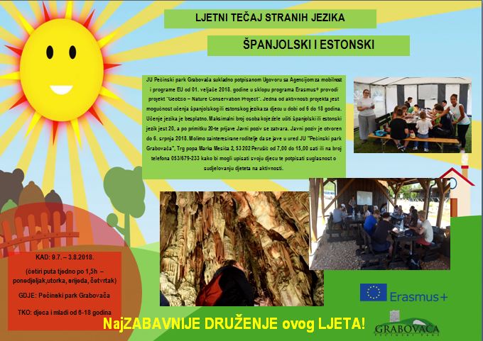 Započela je provedba petog po redu europskog volonterskog projekta GeoEco – Nature Conservation Project, financiranog iz programa Erasmus+ u sklopu kojeg će Pećinski park Grabovača ugostiti 15 volontera iz Španjolske i Estonije na mjesec i pol dana (2.7.-17.8.2018.). Jedna od aktivnosti projekta jest mogućnost učenja španjolskog ili estonskog jezika za djecu u dobi od 6 do 18 godina. Učenje jezika je besplatno, a provodit će se u periodu od 9. srpnja. do 3. kolovoza 2018. četiri puta tjedno (ponedjeljak,utorak, srijeda, četvrtak) po 1,5h. Tečaj jezika provoditi će se u Pećinskom parku Grabovača. Maksimalni broj osoba koje žele učiti španjolski ili estonski jezik jest 20, a po primitku 20-te prijave Javni poziv se zatvara. Javni poziv je otvoren do 6. srpnja 2018.