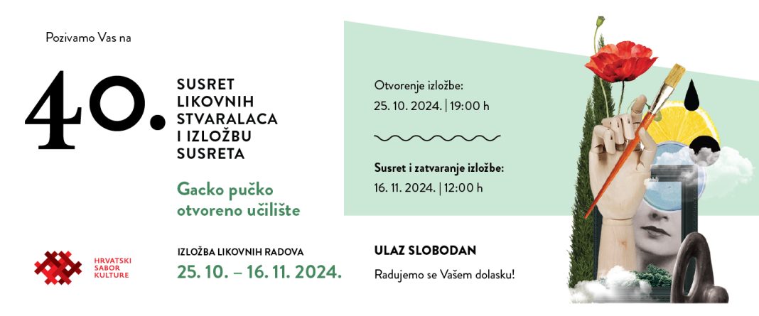 40. izdanje Susreta likovnih stvaralaca, likovne manifestacije koju organizira Hrvatski sabor kulture i koja svake godine okuplja hrvatske likovne udruge i najuspješnije autore, ove se godine održava u Otočcu u Gackom pučkom otvorenom učilištu, gdje je započela 25. listopada 2024. otvorenjem izložbe u maloj dvorani na katu zgrade.