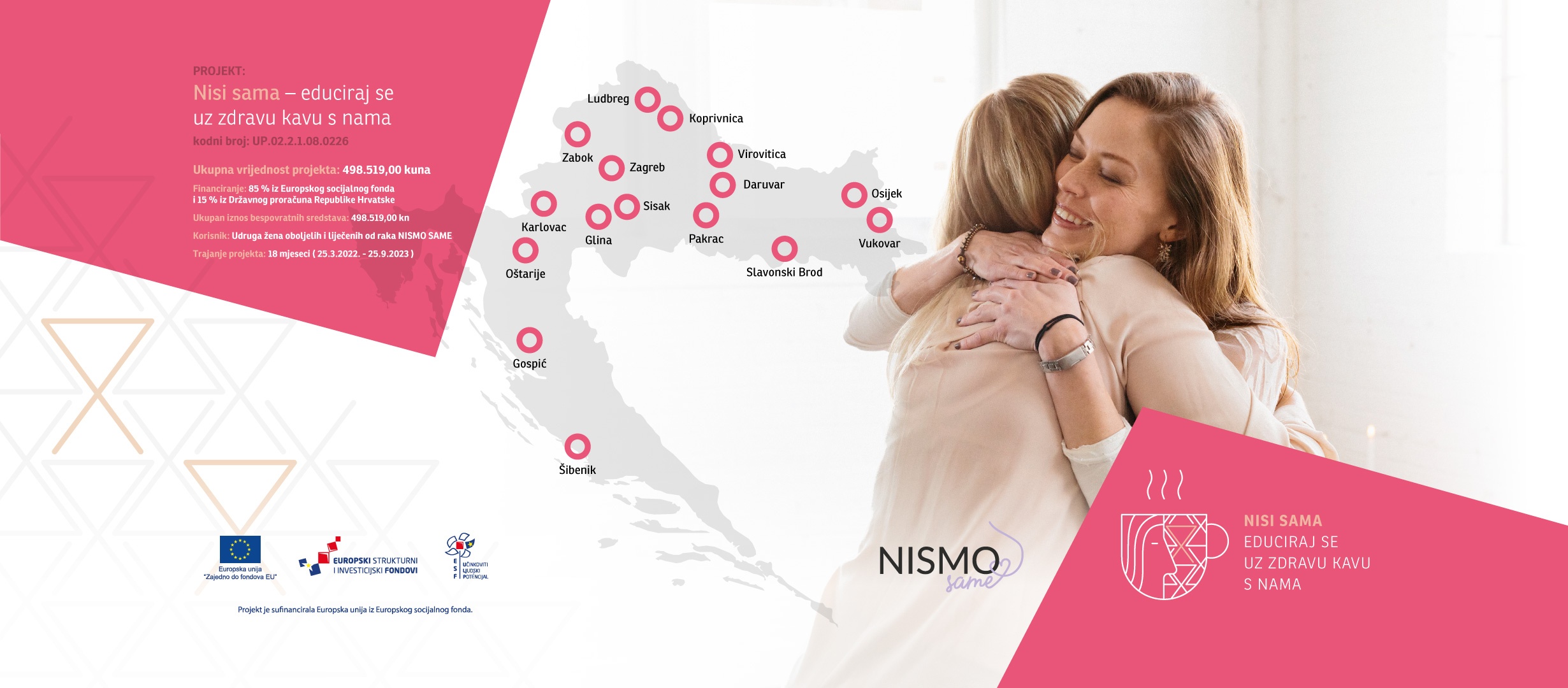 Udruga žena oboljelih i liječenih od raka Nismo same u sklopu svog projekta „Nisi sama – educiraj se uz zdravu kavu s nama“ održava niz aktivnosti vezanih uz informiranje žena svih dobnih skupina o važnosti prevencije raka dojke. Projekt obuhvaća organizaciju „zdravih kava“ u 15 gradova diljem Hrvatske i devet radionica u prostoru Udruge. Kave su namijenjene ženama svih generacija, bez obzira na njihovo zdravstveno stanje, a zamišljene su kao neformalni razgovor građana s liječnicima o svim pitanjima koja ih muče, a koja ili nemaju kome postaviti ili ih se ne usude postaviti svome liječniku.