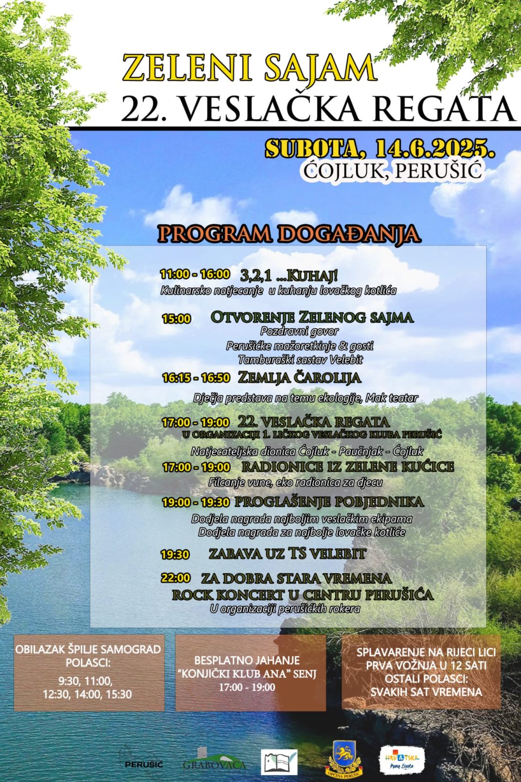 Na obali rijeke Like, na poznatoj lokaciji Ćojluk, ove će se subote, 14. lipnja 2025. godine, s početkom u 15 sati, održati šesti Zeleni sajam i 22. Veslačka regata. Manifestacija u organizaciji 1. Ličkog veslačkog kluba Perušić već više od dva desetljeća spaja ljubitelje sporta i prirode, a ovogodišnje izdanje najavljuje bogat program za sve generacije.