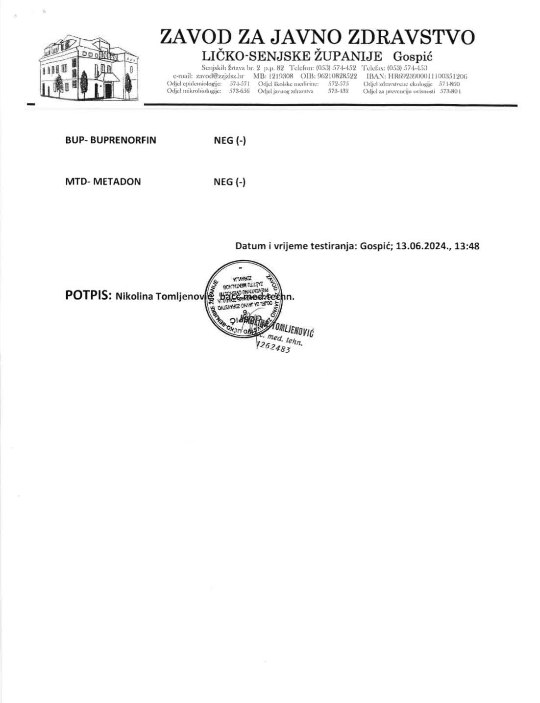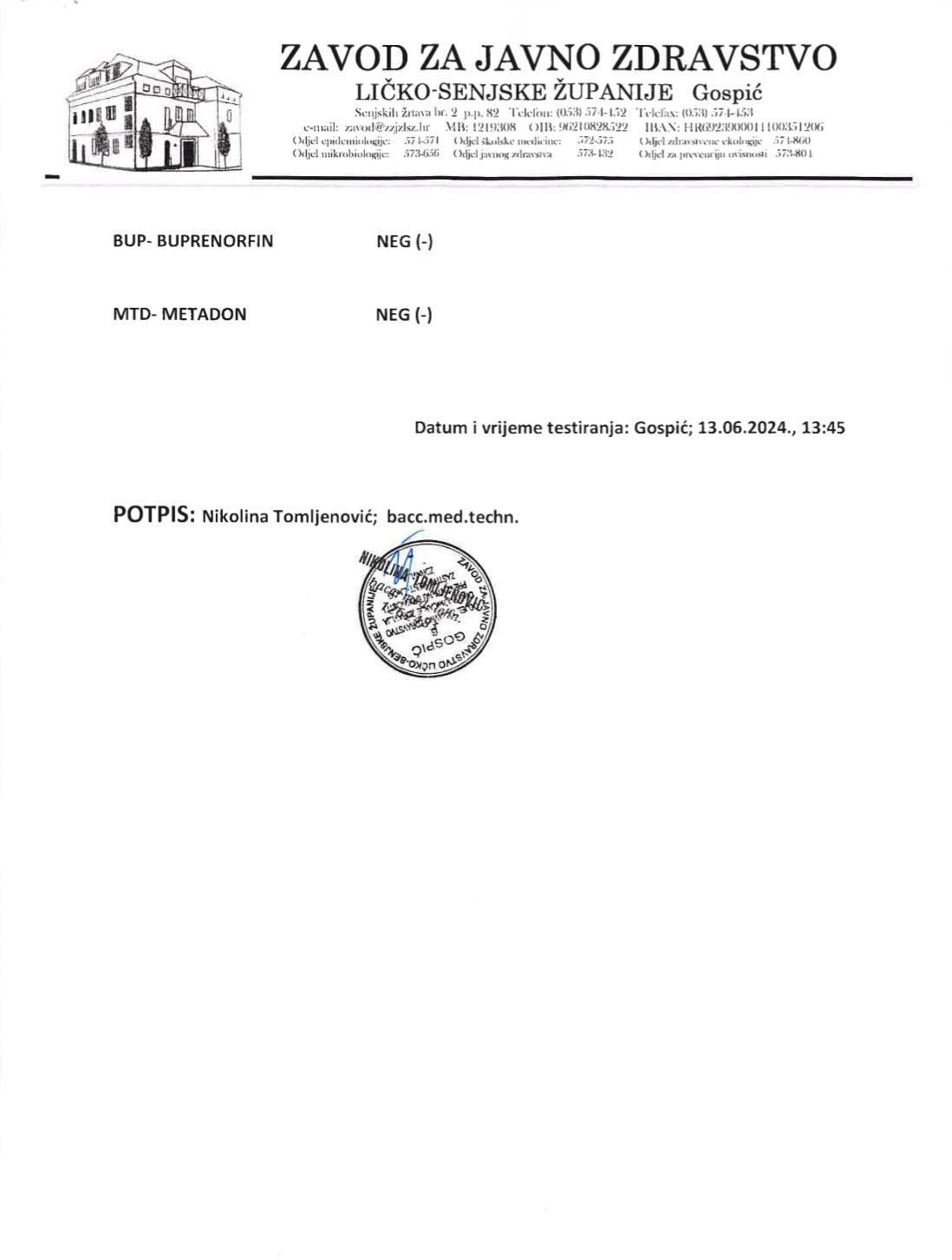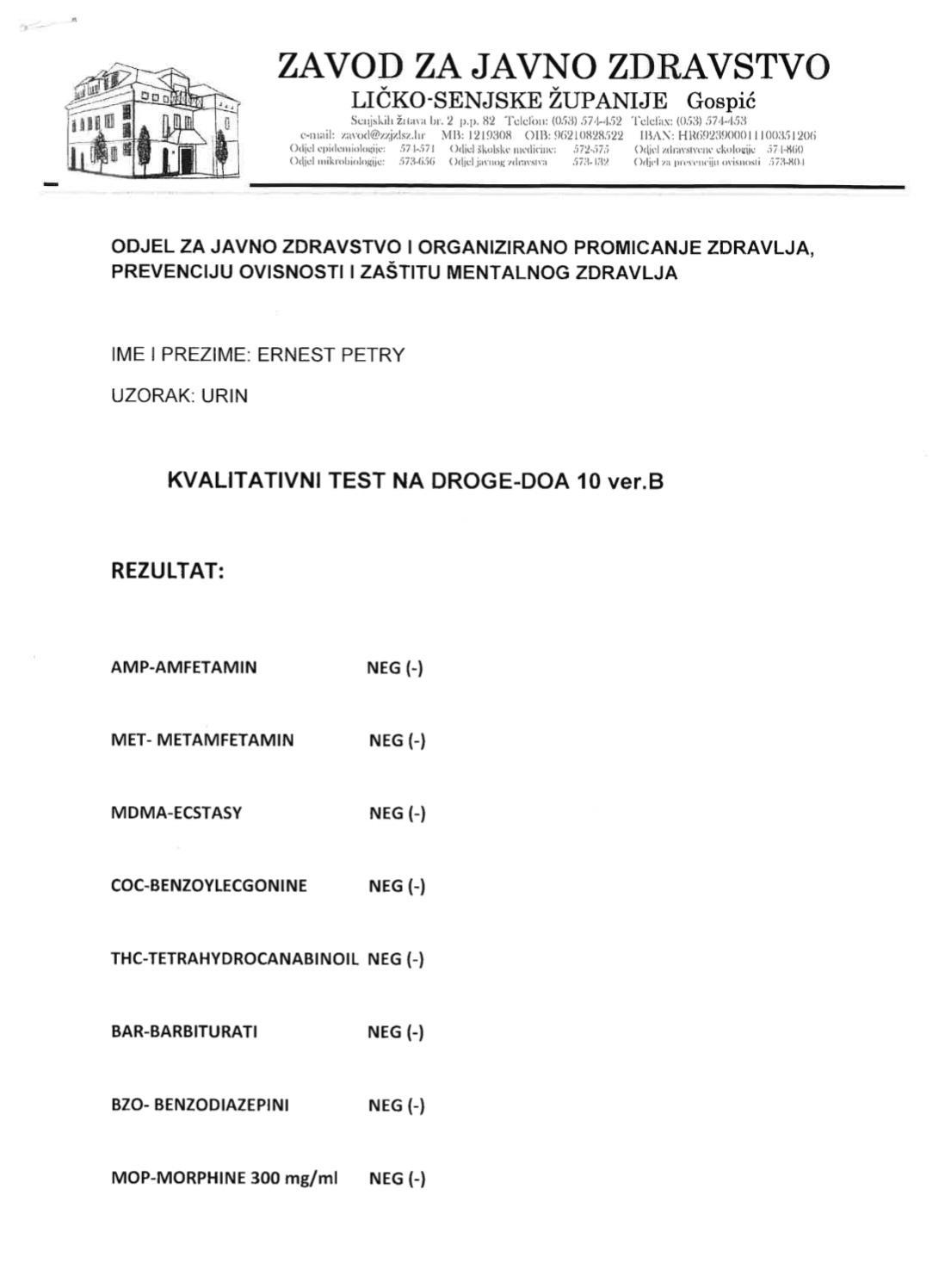 Rezultati testiranja, koji su bili dostupni unutar nekoliko minuta, pokazali su da su župan Petry i zamjenica Orešković Brkljačić negativni na bilo koju od testiranih supstanci. Ovaj potez uslijedio je nakon najave kandidata za gradonačelnika Gospića, Darka Milinovića (LiPO) i Josa Vrkljana (HDZ), te njihovih zamjenika Kristine Prša i Ivice Ice Kovačevića, koji su potvrdili kako će se sutra podvrgnuti istom testu.