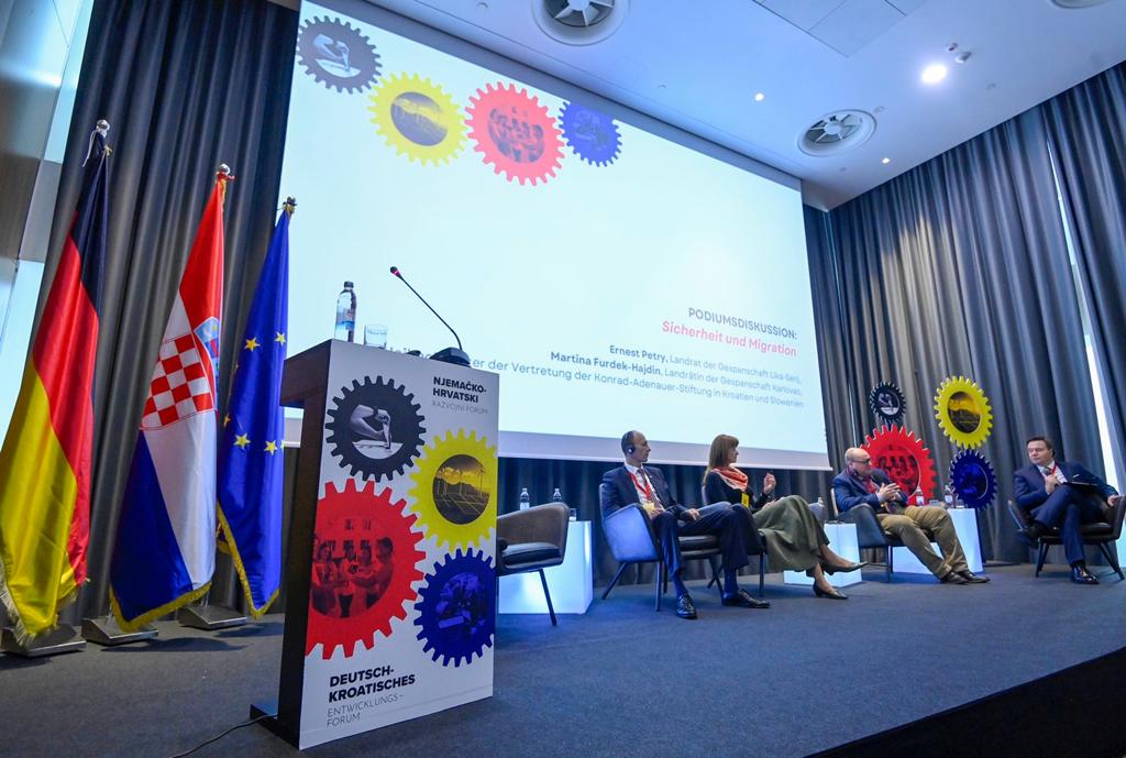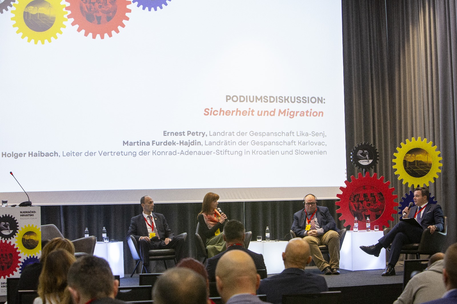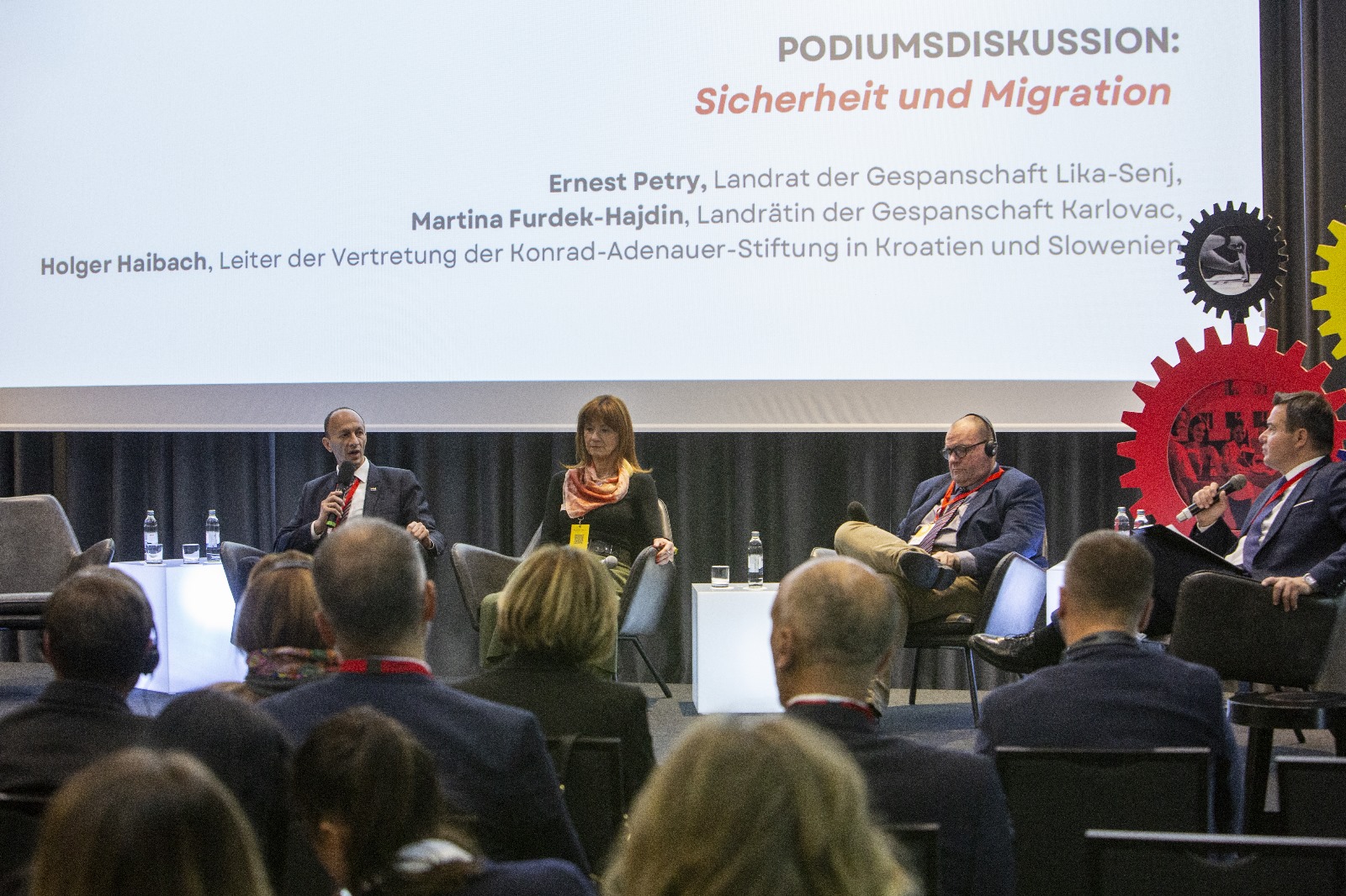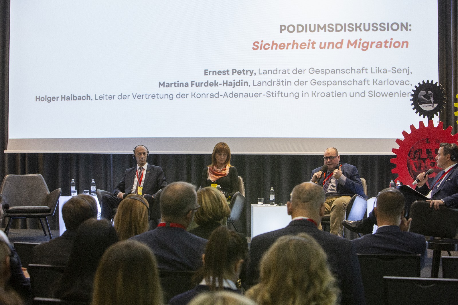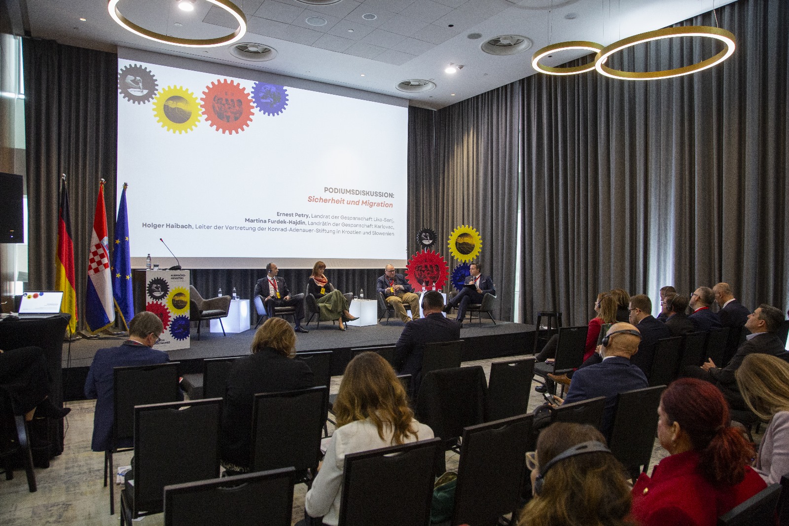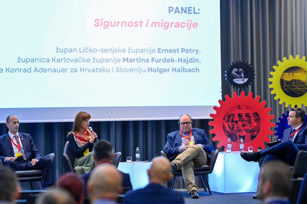 Panel “Sigurnost i migracije” okupio je brojne ugledne govornike, uključujući Andreju Metelko-Zgombić, državnu tajnicu Ministarstva vanjskih i europskih poslova RH, Stephana Logea, predsjednika savezne pokrajine Dahme-Spreewald, Ernesta Petryja, župana Ličko-senjske županije, Martinu Furdek-Hajdin, županicu Karlovačke županije, i Holgera Haibacha, direktora predstavništva Zaklade Konrad Adenauer za Hrvatsku i Sloveniju.